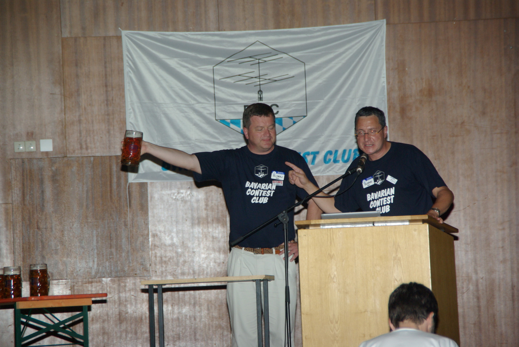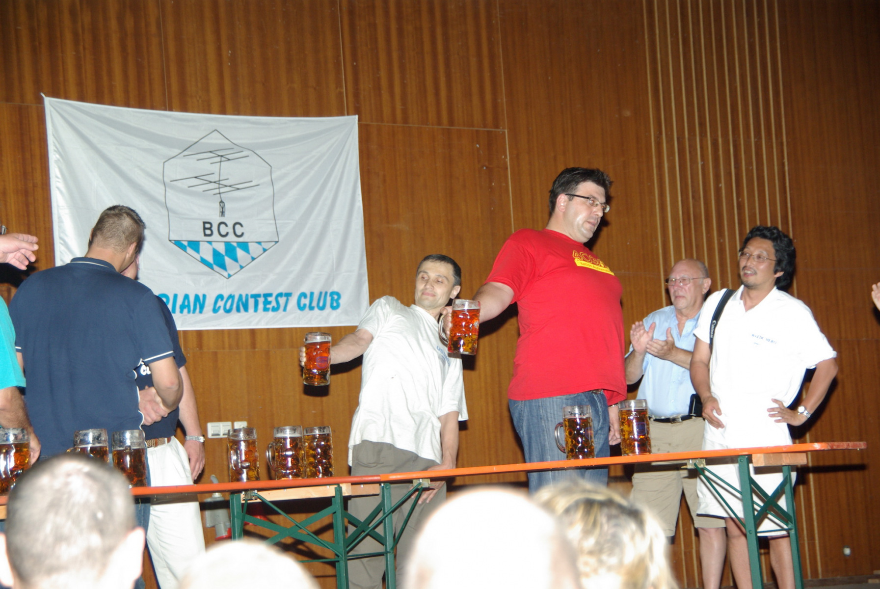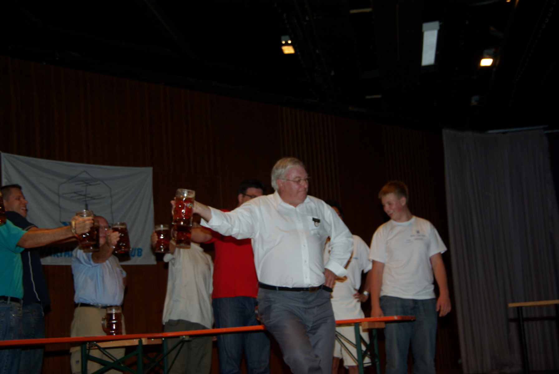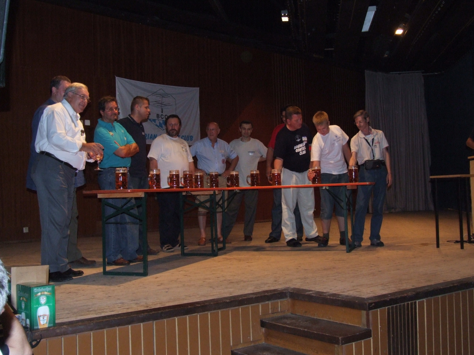 Nachdem alle gut gegessen hatten und satt waren stand noch ein besonderer Höhepunkt auf der Tagesordnung: Der MKS-Contest. Beim „Maßkrug-Stemmen-Contest“ geht es darum, einen Maßkrug Bier in definierter Armhaltung so lange wie möglich zu halten. Ben, DL6RAI erklärte zusammen mit unserem Braumeister Alex, DL1MAJ die Regeln. Zur Teilnahme waren alle anwesenden Nationen aufgefordert. Nach einigem Zögern kam dann doch eine große Truppe zusammen, die sich der Herausforderung stellen wollte: England, Frankreich, Schweiz, Polen,