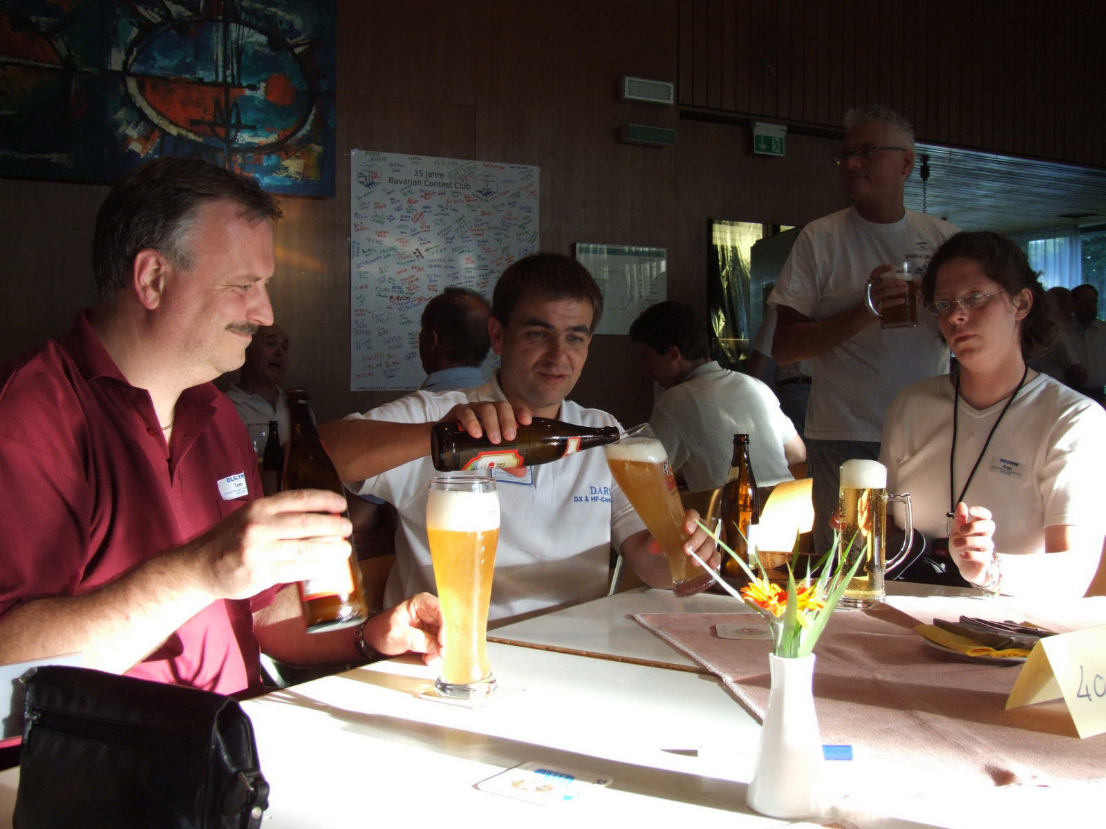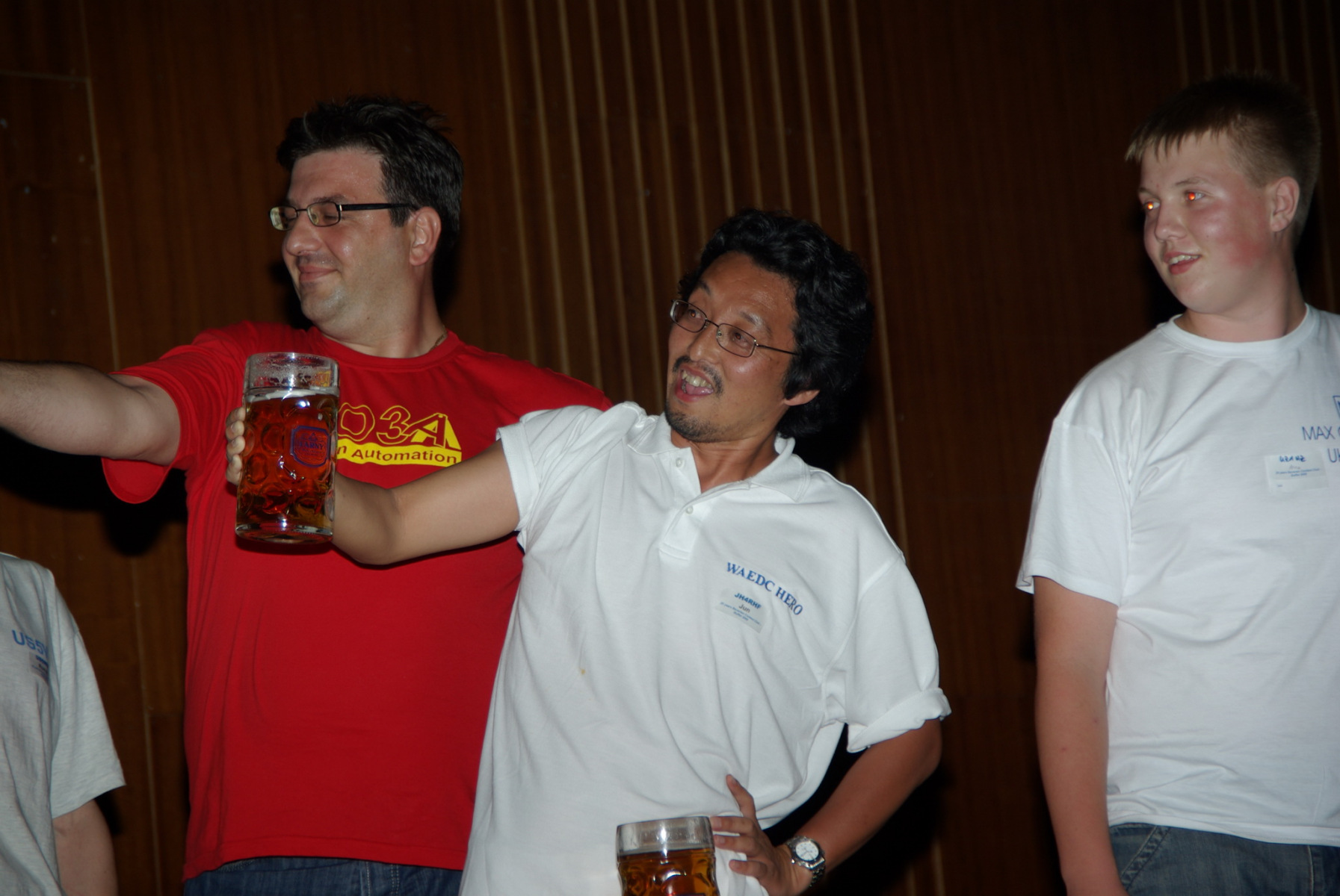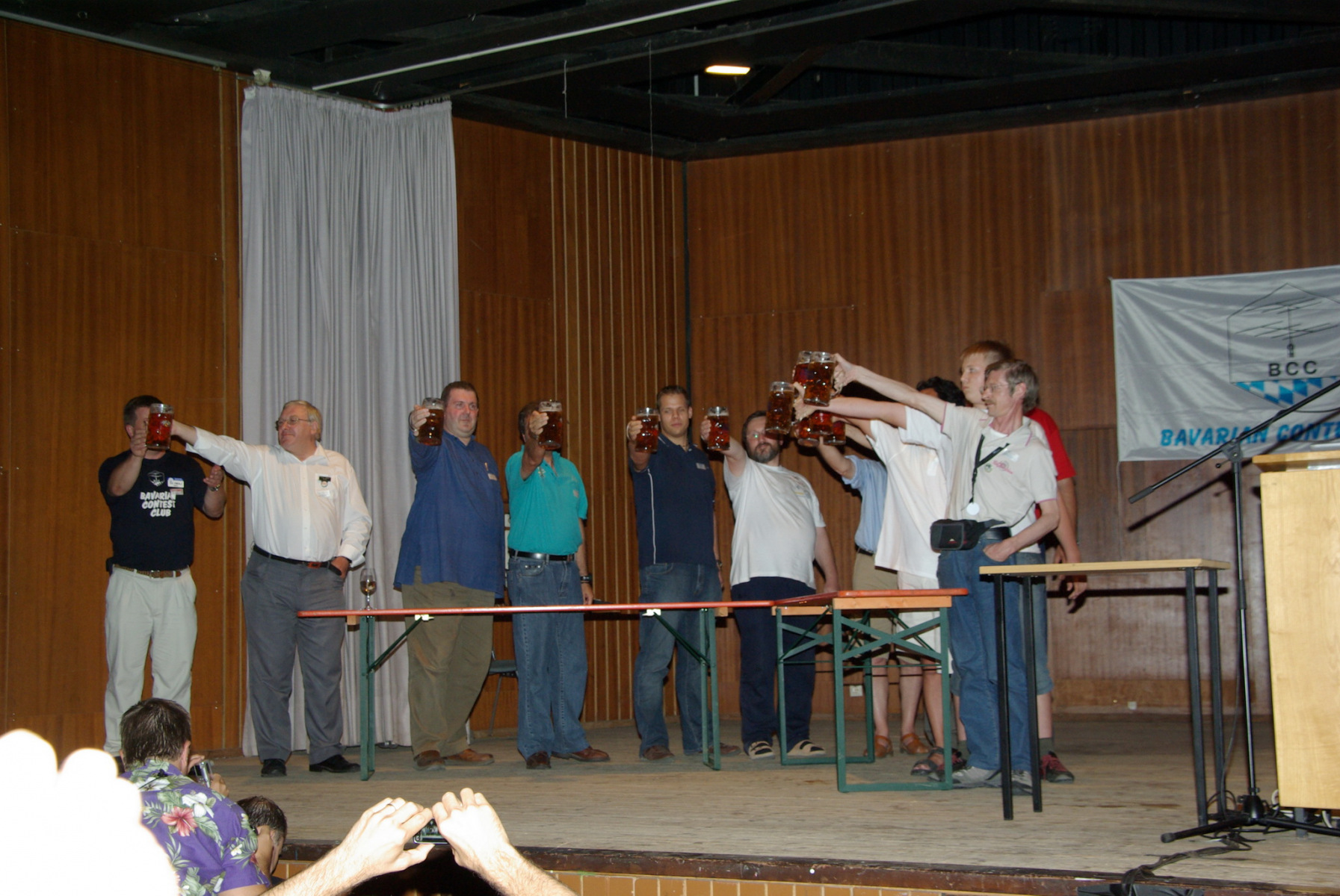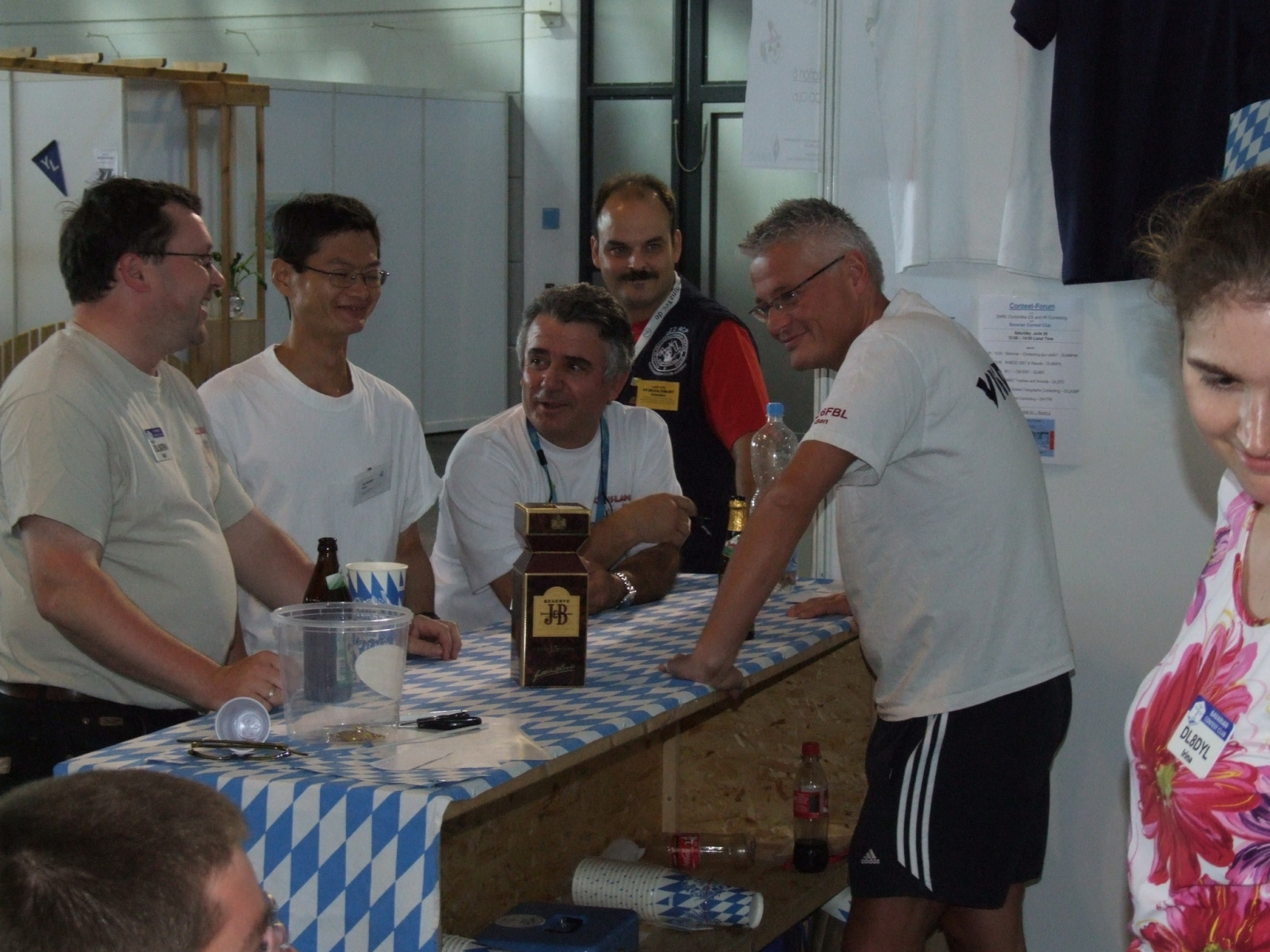 Nachdem alle gut gegessen hatten und satt waren stand noch ein besonderer Höhepunkt auf der Tagesordnung: Der MKS-Contest. Beim „Maßkrug-Stemmen-Contest“ geht es darum, einen Maßkrug Bier in definierter Armhaltung so lange wie möglich zu halten. Ben, DL6RAI erklärte zusammen mit unserem Braumeister Alex, DL1MAJ die Regeln. Zur Teilnahme waren alle anwesenden Nationen aufgefordert. Nach einigem Zögern kam dann doch eine große Truppe zusammen, die sich der Herausforderung stellen wollte: England, Frankreich, Schweiz, Polen,