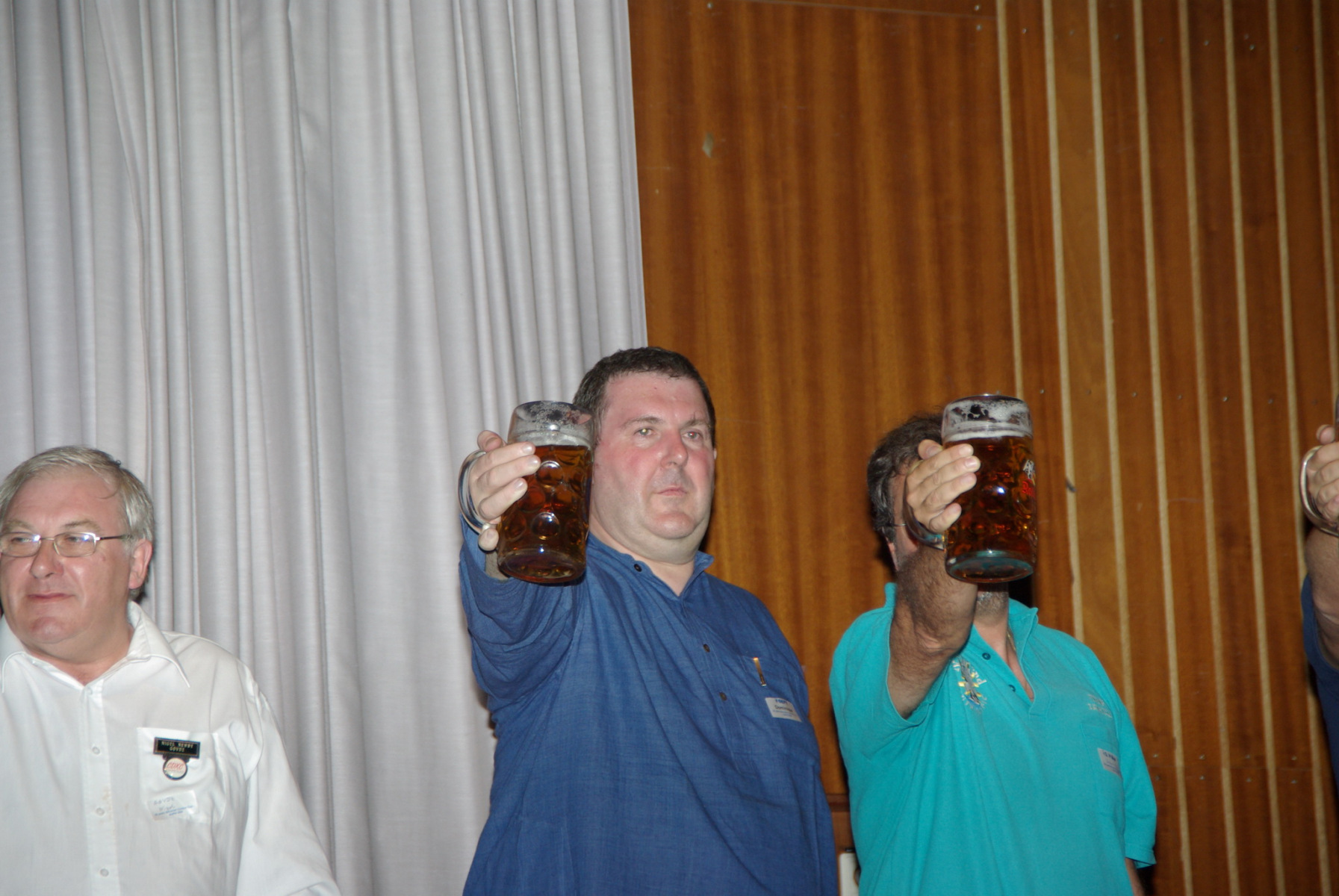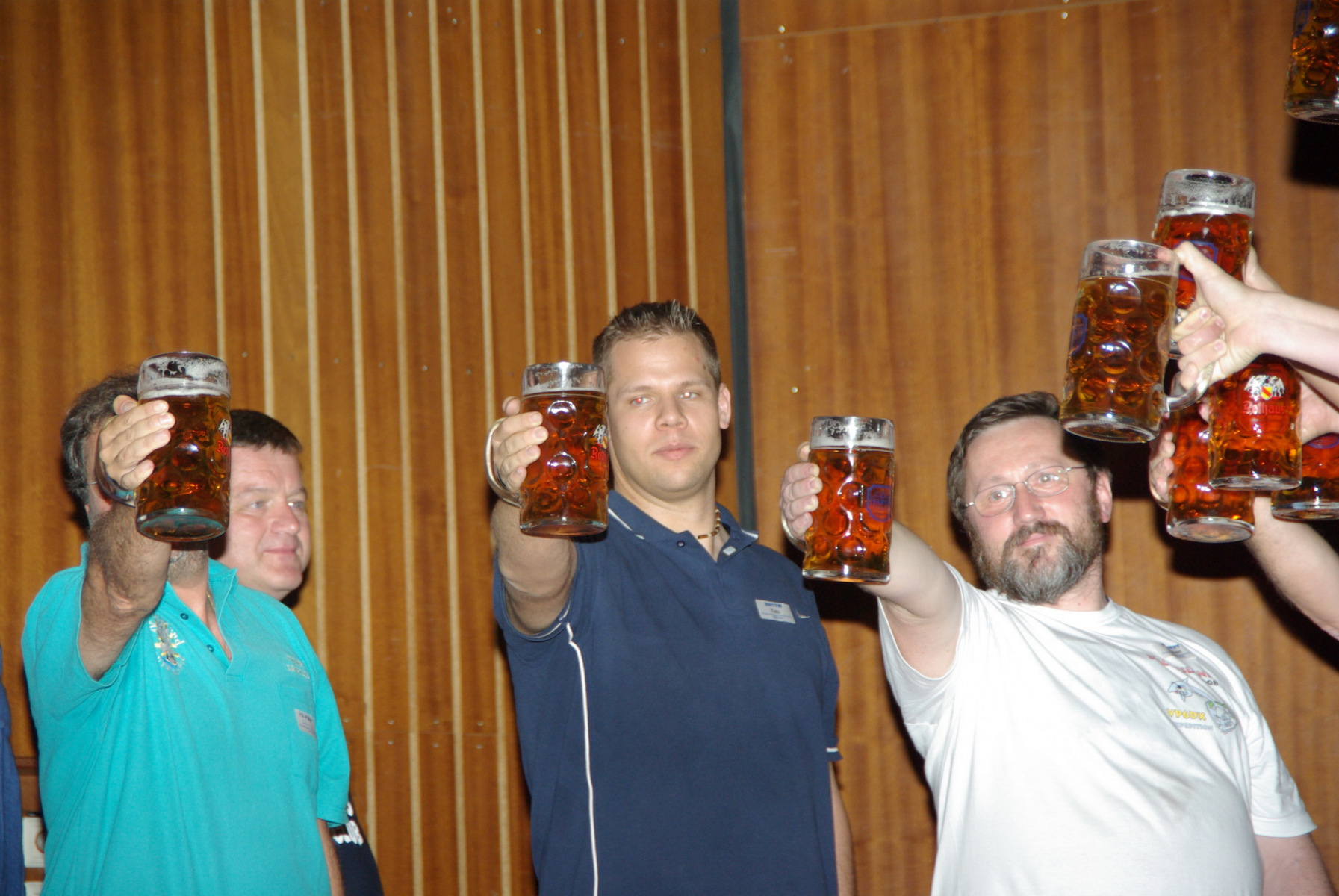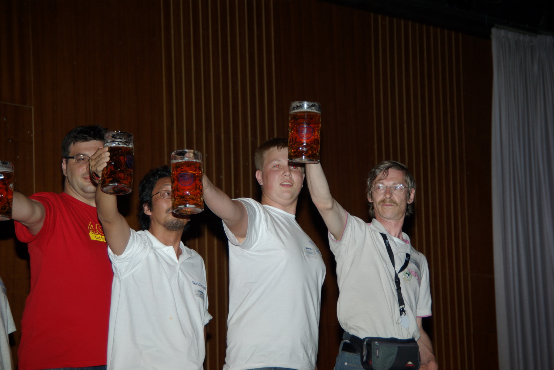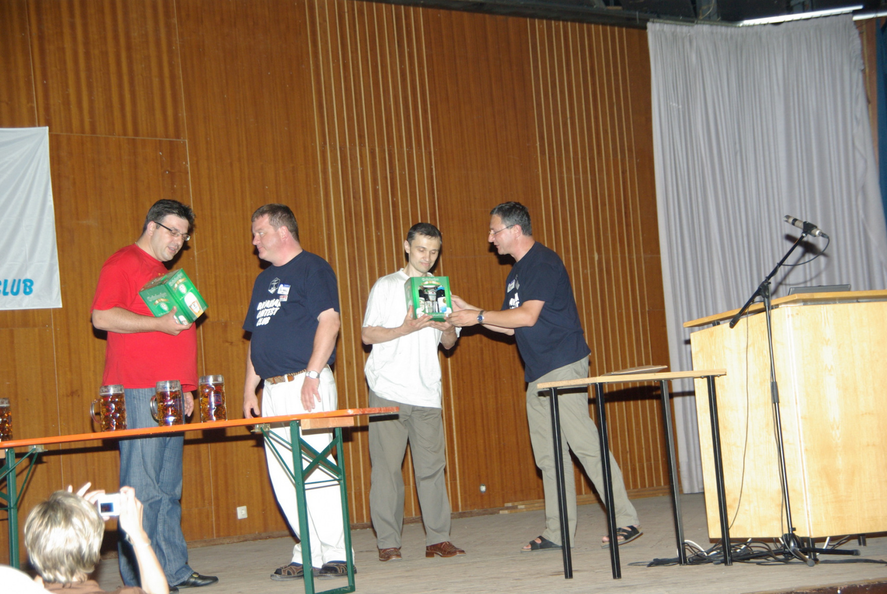 Nachdem alle gut gegessen hatten und satt waren stand noch ein besonderer Höhepunkt auf der Tagesordnung: Der MKS-Contest. Beim „Maßkrug-Stemmen-Contest“ geht es darum, einen Maßkrug Bier in definierter Armhaltung so lange wie möglich zu halten. Ben, DL6RAI erklärte zusammen mit unserem Braumeister Alex, DL1MAJ die Regeln. Zur Teilnahme waren alle anwesenden Nationen aufgefordert. Nach einigem Zögern kam dann doch eine große Truppe zusammen, die sich der Herausforderung stellen wollte: England, Frankreich, Schweiz, Polen,