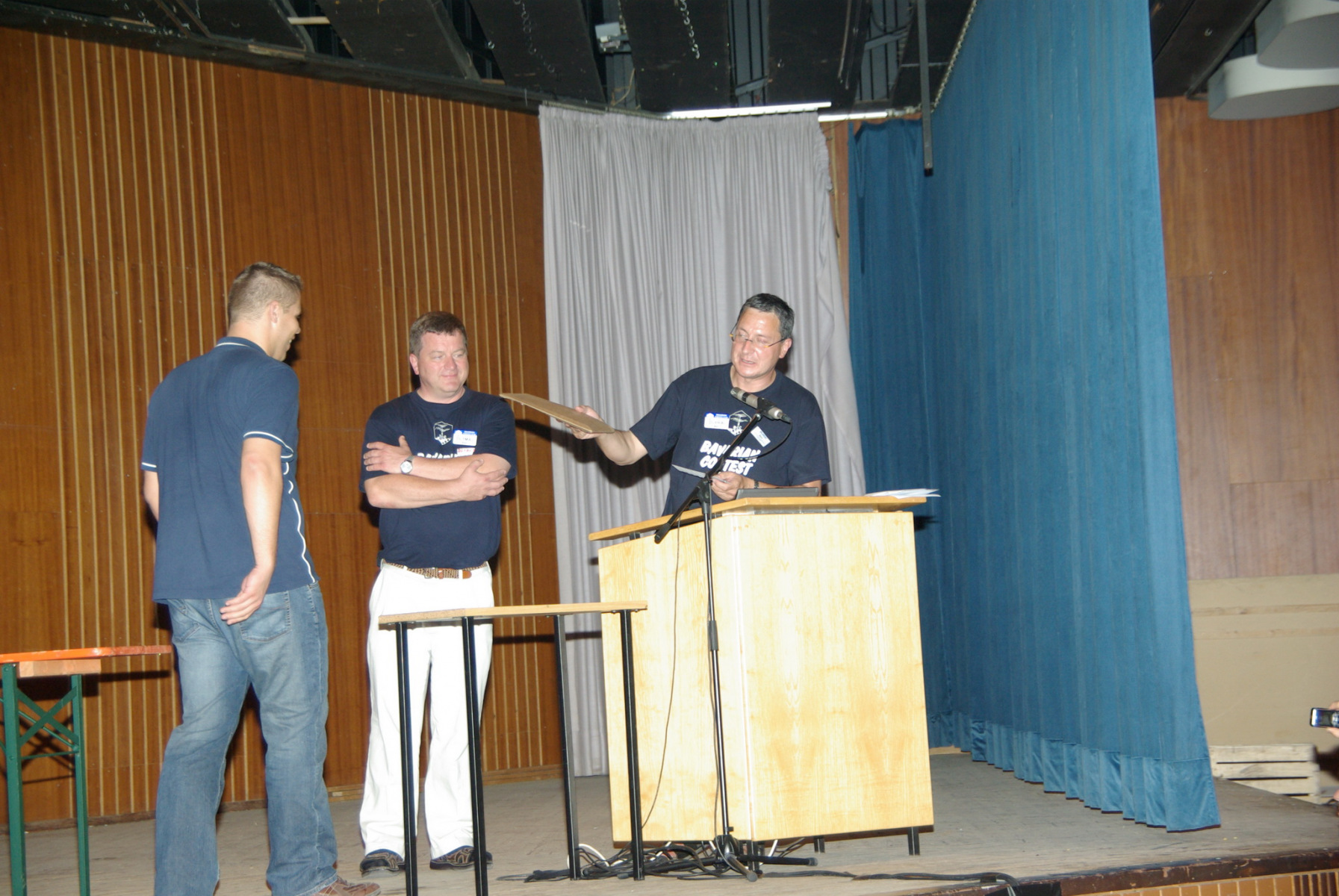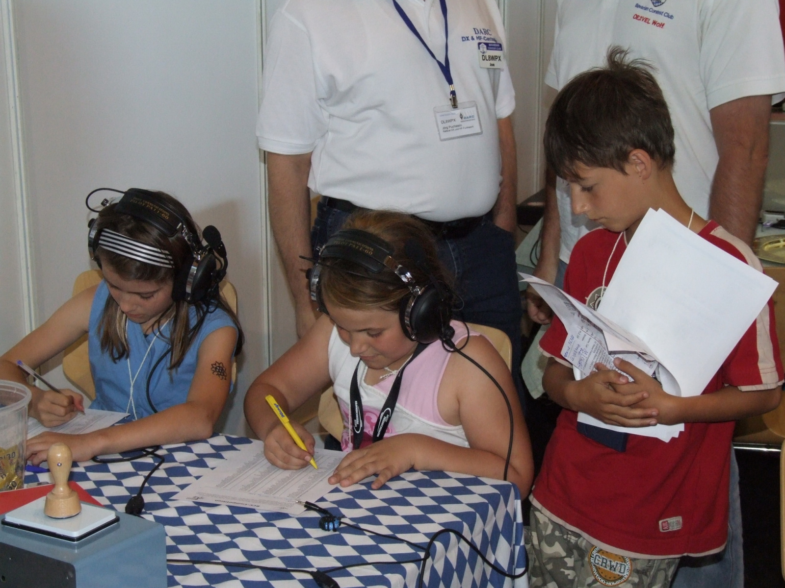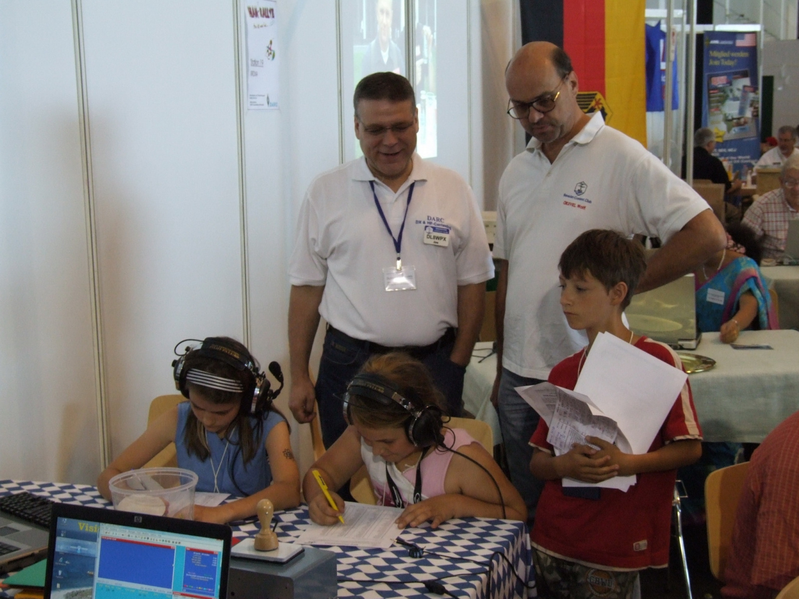 Aber auch unser Contester-Nachwuchs hatte wieder die Chance, bei uns an der Messe-Rallye teilzunehmen und sich im Vornamen-PileUp zu üben. Durch Veränderung der Bänder war es in diesem Jahr insofern einfacher, das vor allem die älteren Teilnehmer mehr Vornamen identifizieren konnten. Das hat den Kindern und Jugendlichen in Summe deutlich mehr Spaß gemacht, weil einfach das Erfolserlebnis größer war. Der beste Teilnehmer mit 51 richtigen Vornamen bekam von uns einen Einkaufsgutschein von Mediamarkt, außerdem zogen wir aus allen Teilnehmern jeden Tages (Freitag 24, Samstag 27) noch Gutscheingewinner. Die Übergabe fand während der Auswertung der Rallye auf der DARC-Bühne durch Ben, DL6RAI und Heijo, DJ1OJ statt.