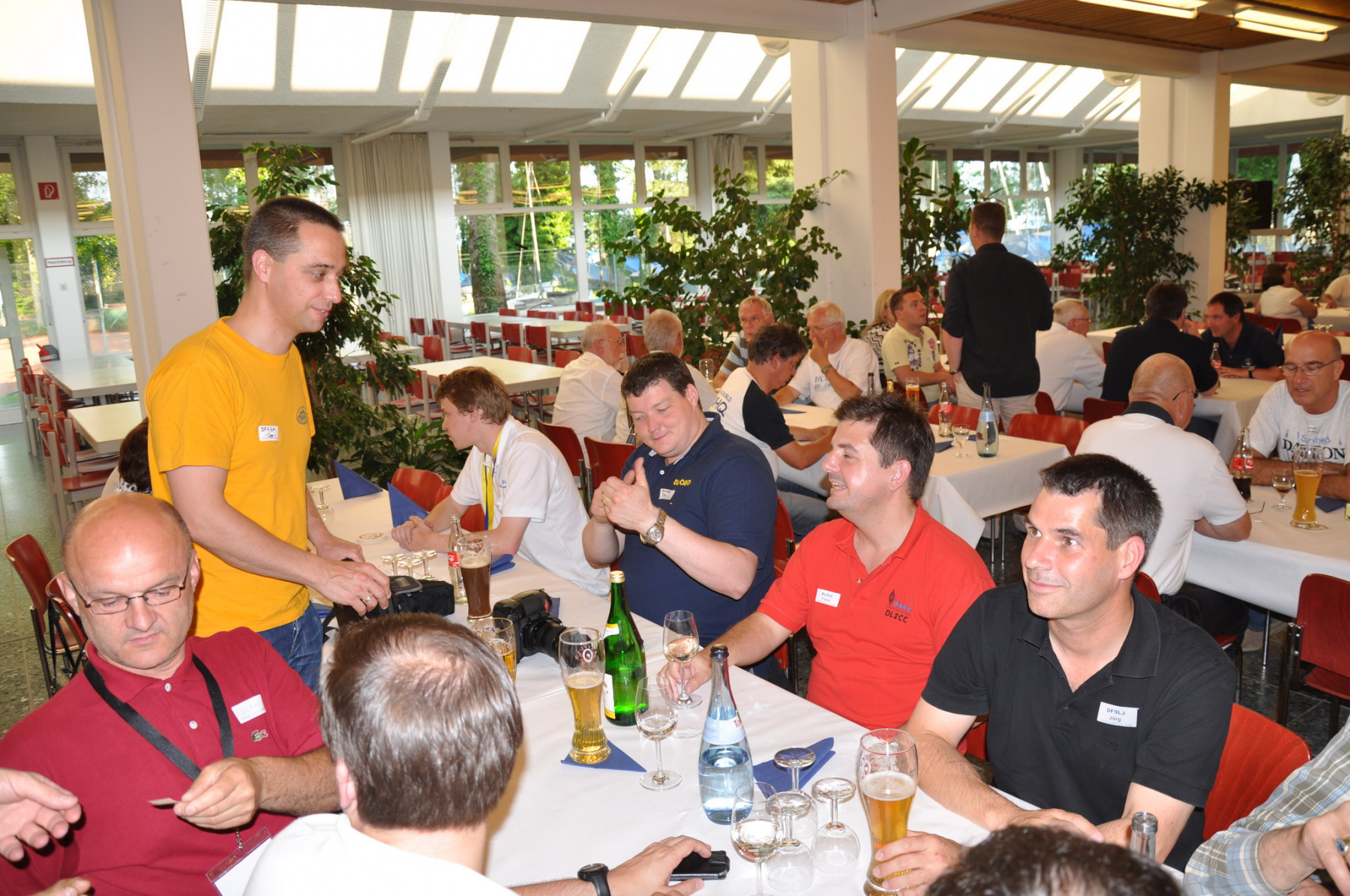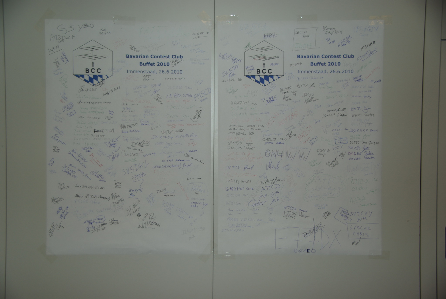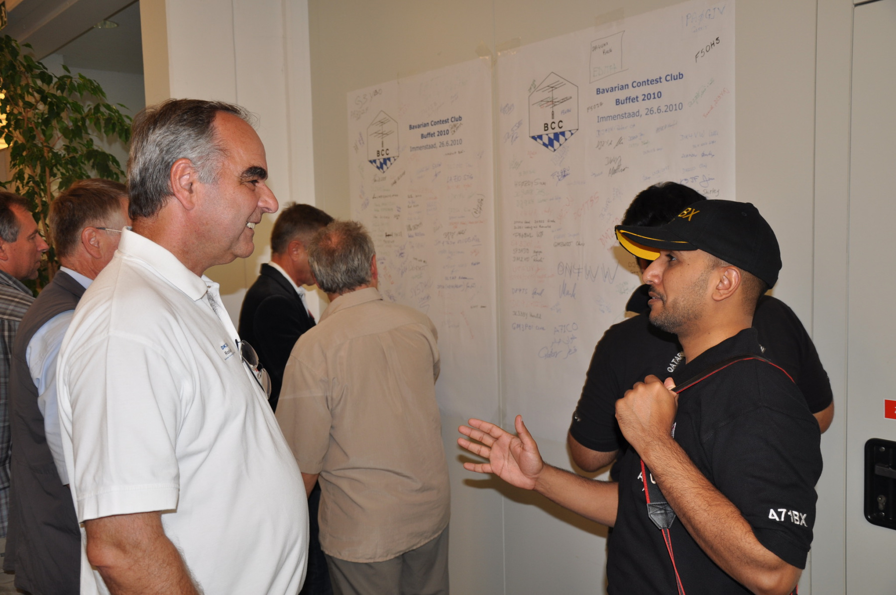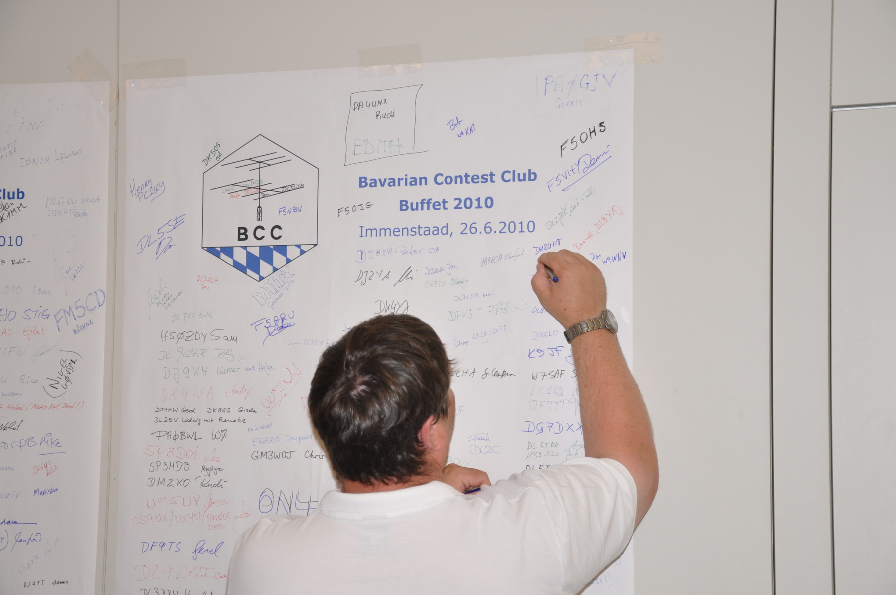 Während am Freitag Abend die BCCler auf vielen verschiedenen Veranstaltungen zu finden waren – vom Grillen auf dem Zeltplatz über das Treffen der DRCG bis hin zum RRDXA-Abend im Adler – traf man sich am Samstag traditionell zum BCC-Buffet. Wir hatten zum zweiten Mal in die Kantine der EADS in Immenstaad eingeladen. Die rund 330 Gästen in diesem Jahr kamen aus allen Kontinenten. Traditionell verewigten sich alle auf unserer Unterschriftenwand, bevor sie im wieder schön eingerichteten Raum ihren Platz suchen. DF2CK, DK7MCX, DK3GI sowie DL2NCY und DL8DYL bildeten das Empfangskommitee und standen den Gästen auch für Fragen zur Verfügung.