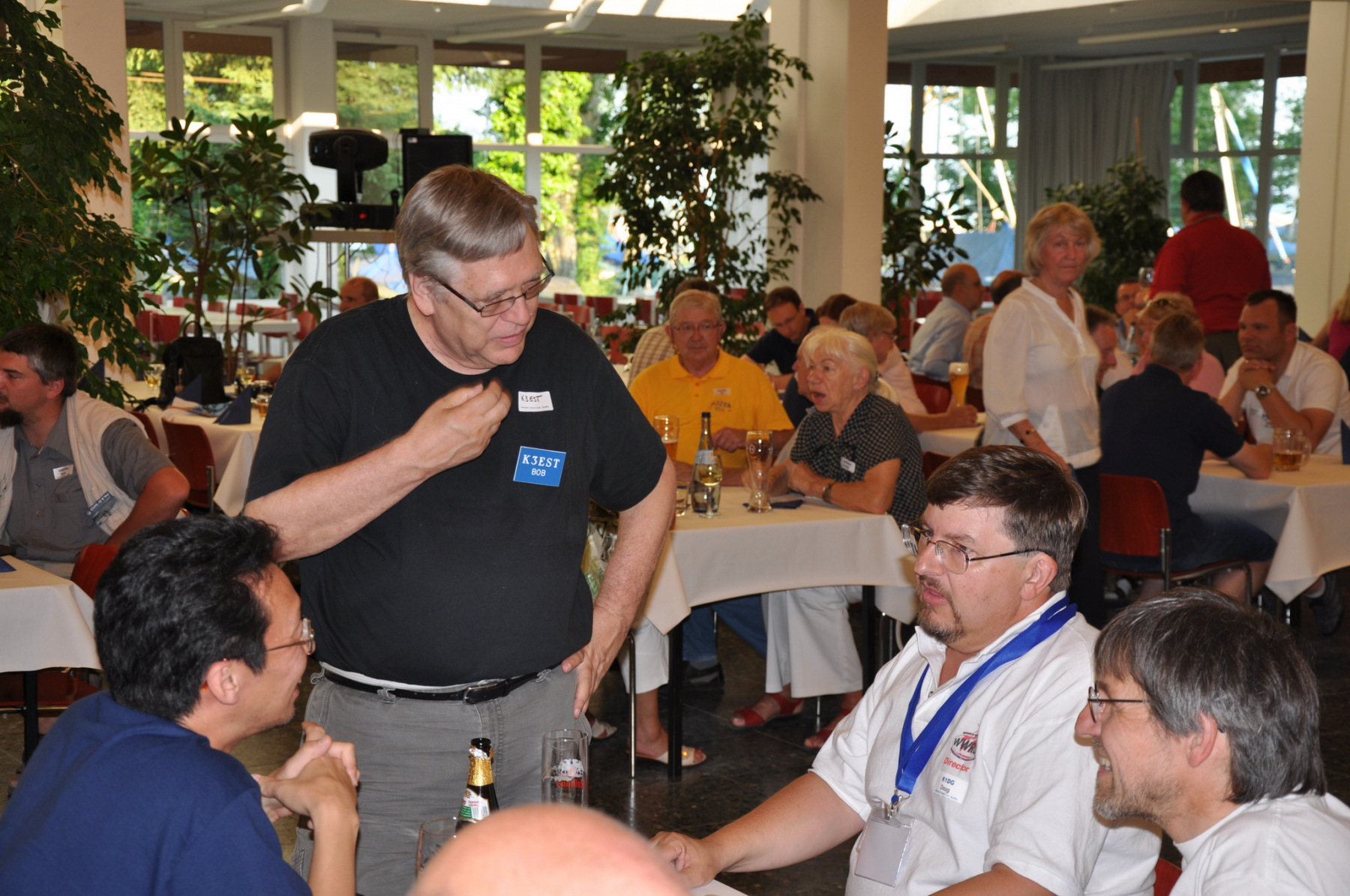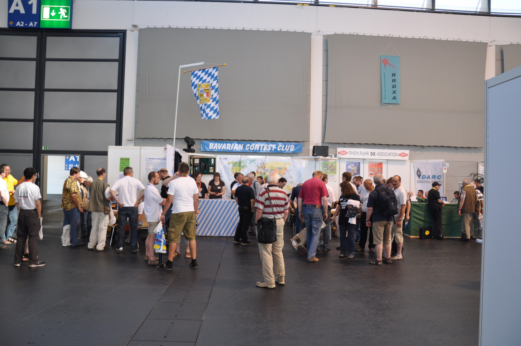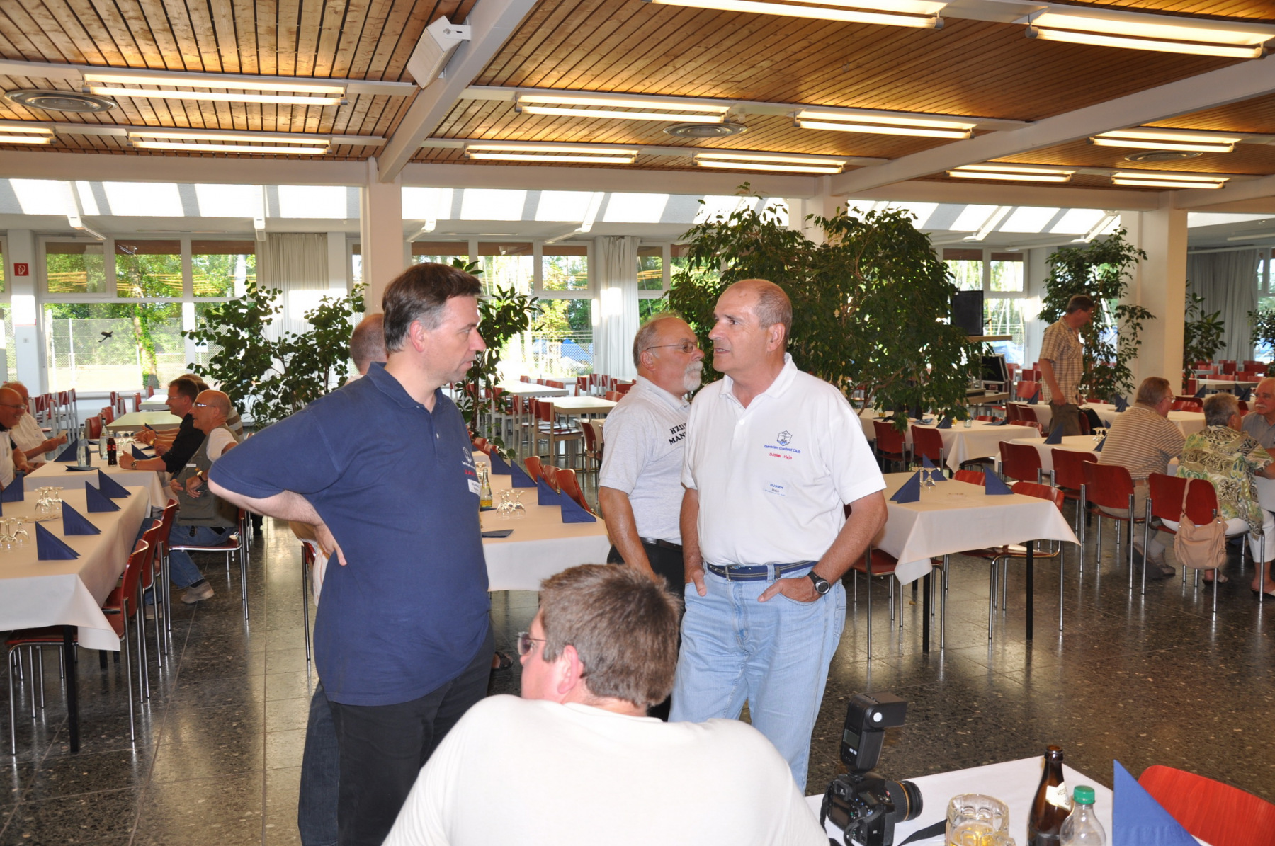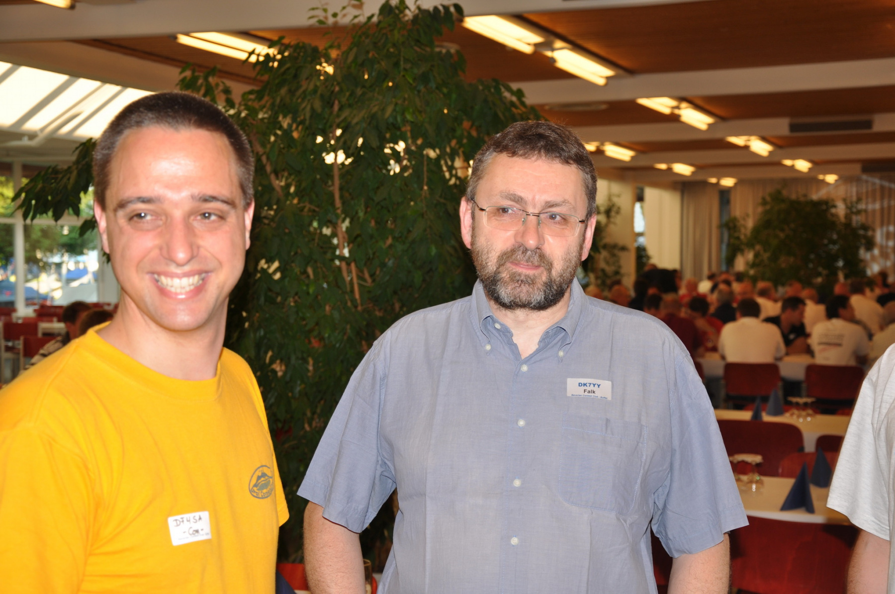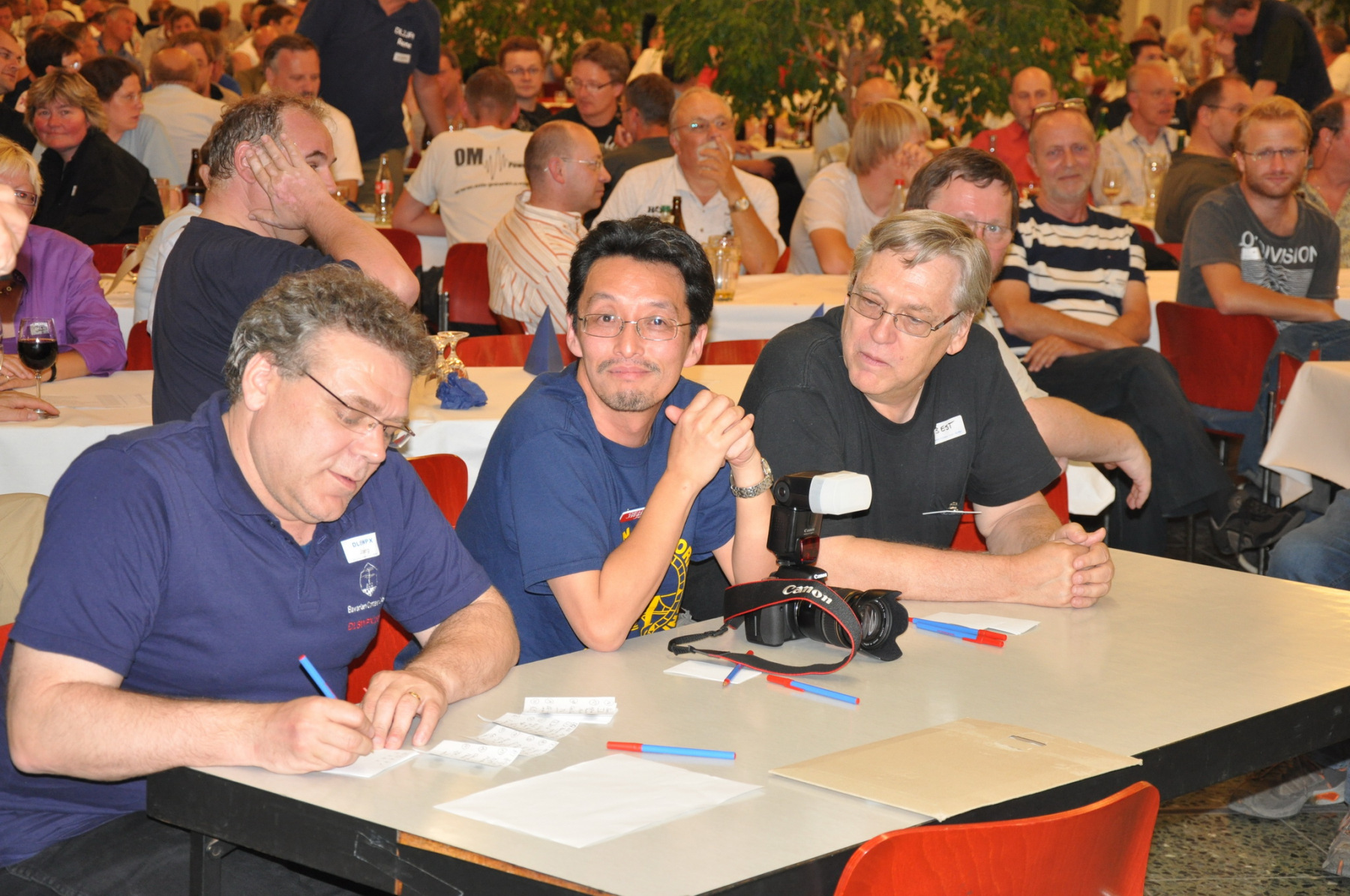 Während am Freitag Abend die BCCler auf vielen verschiedenen Veranstaltungen zu finden waren – vom Grillen auf dem Zeltplatz über das Treffen der DRCG bis hin zum RRDXA-Abend im Adler – traf man sich am Samstag traditionell zum BCC-Buffet. Wir hatten zum zweiten Mal in die Kantine der EADS in Immenstaad eingeladen. Die rund 330 Gästen in diesem Jahr kamen aus allen Kontinenten. Traditionell verewigten sich alle auf unserer Unterschriftenwand, bevor sie im wieder schön eingerichteten Raum ihren Platz suchen. DF2CK, DK7MCX, DK3GI sowie DL2NCY und DL8DYL bildeten das Empfangskommitee und standen den Gästen auch für Fragen zur Verfügung.