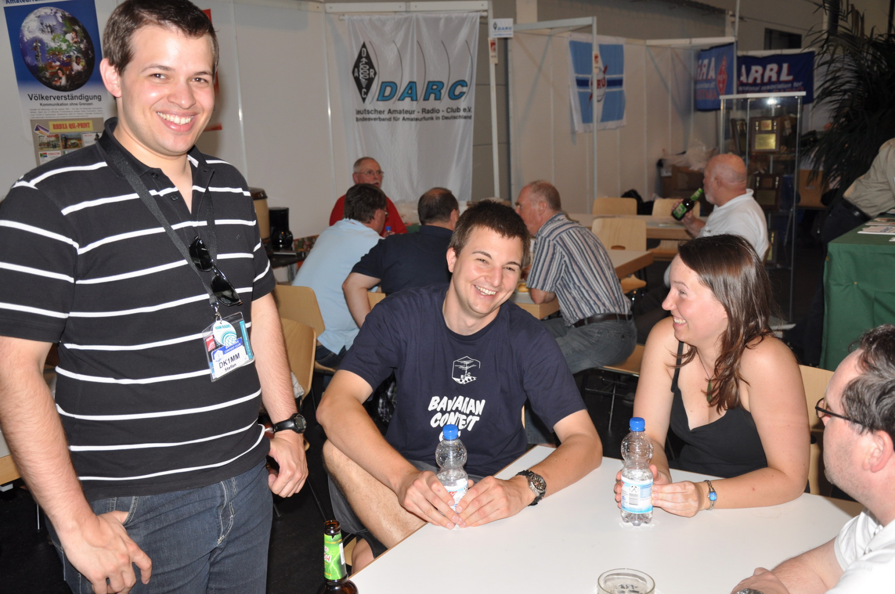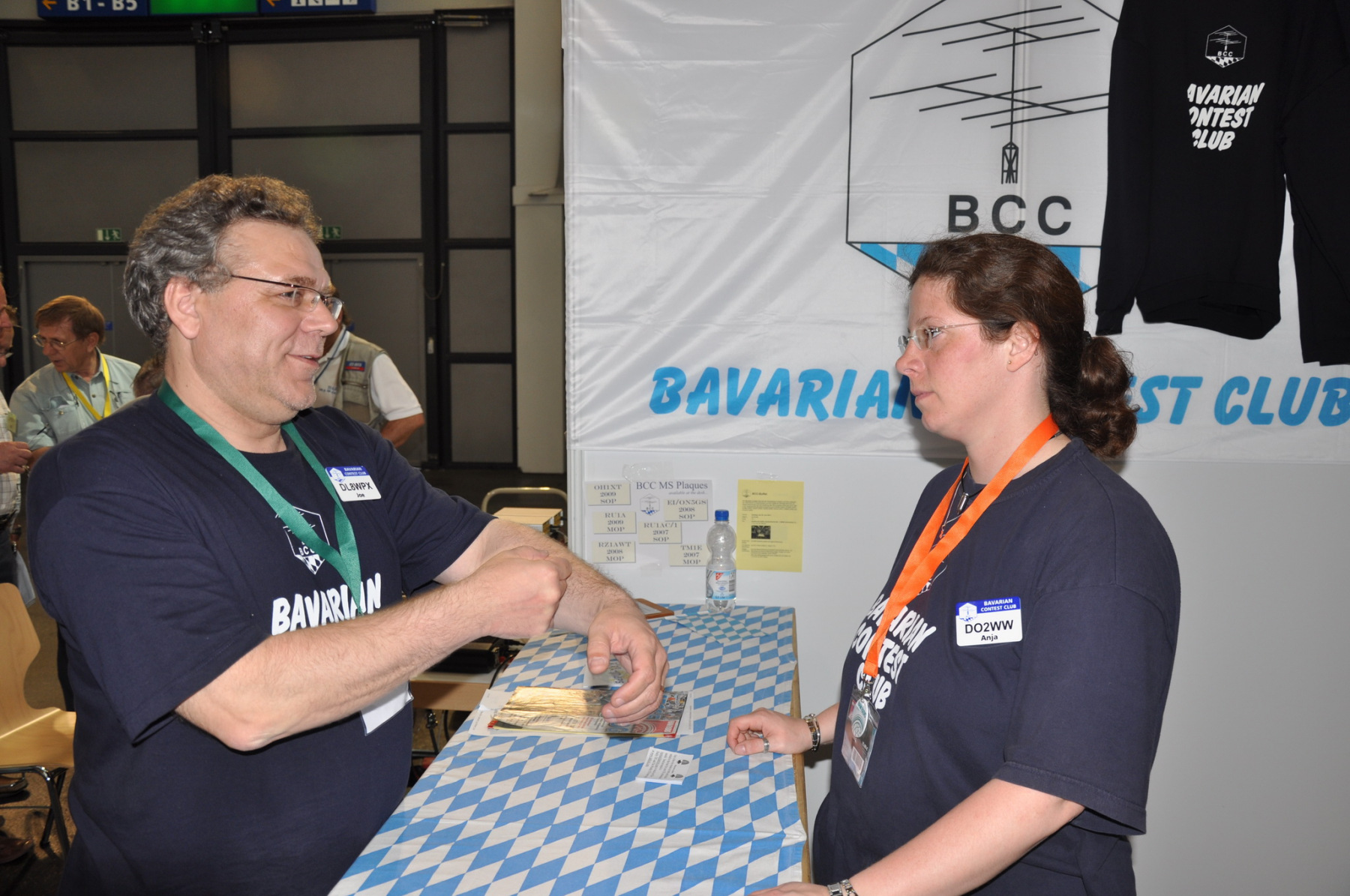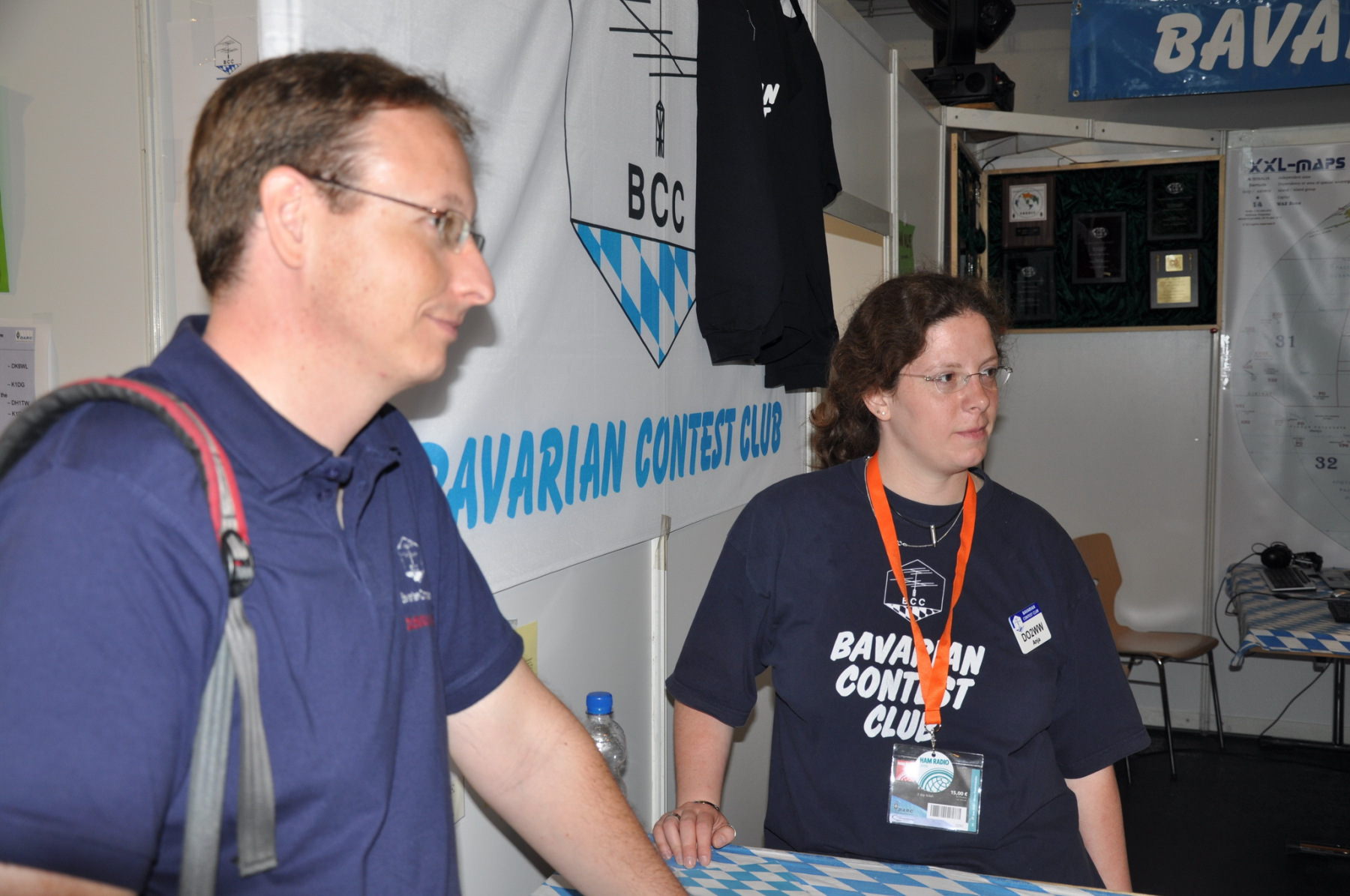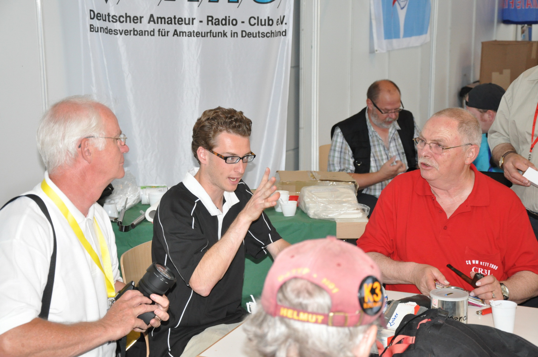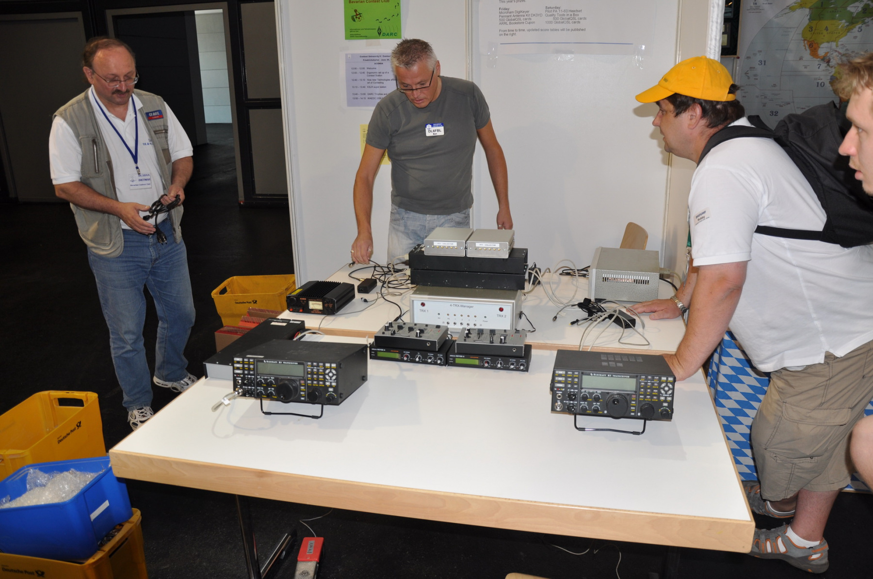 Der Freitag begann hektisch: Die Teilnehmer der ersten deutschen Contestuniversity sollten sich bei uns am Stand ihre Unterlagen abholen. Die Materialien waren inzwischen alle da, aber in vielen Kisten, Tüten und Schachteln. 10 Einzelteile mussten schnellstens in Beutel konfektioniert werden. Zum Glück standen genug Helfer parat, so dass die 150 Exemplare schnell fertig waren und ausgegeben werden konnten. Die ersten CTU-Teilnehmer tauchten auch schon auf und nahmen erfreut ihre Unterlagen samt Namensschild entgegen. Die gelben CTU-Basecaps waren fortan immer wieder auf der Messe zu sehen. Parallel dazu wurde unsere Anmeldeliste fürs BCC-Buffet auch schon deutlich länger, die BCC-Challenge für Erwachsene startete und auch die Kinder, die an der HAM Rallye teilnahmen, konnten das Namenspileup hören.