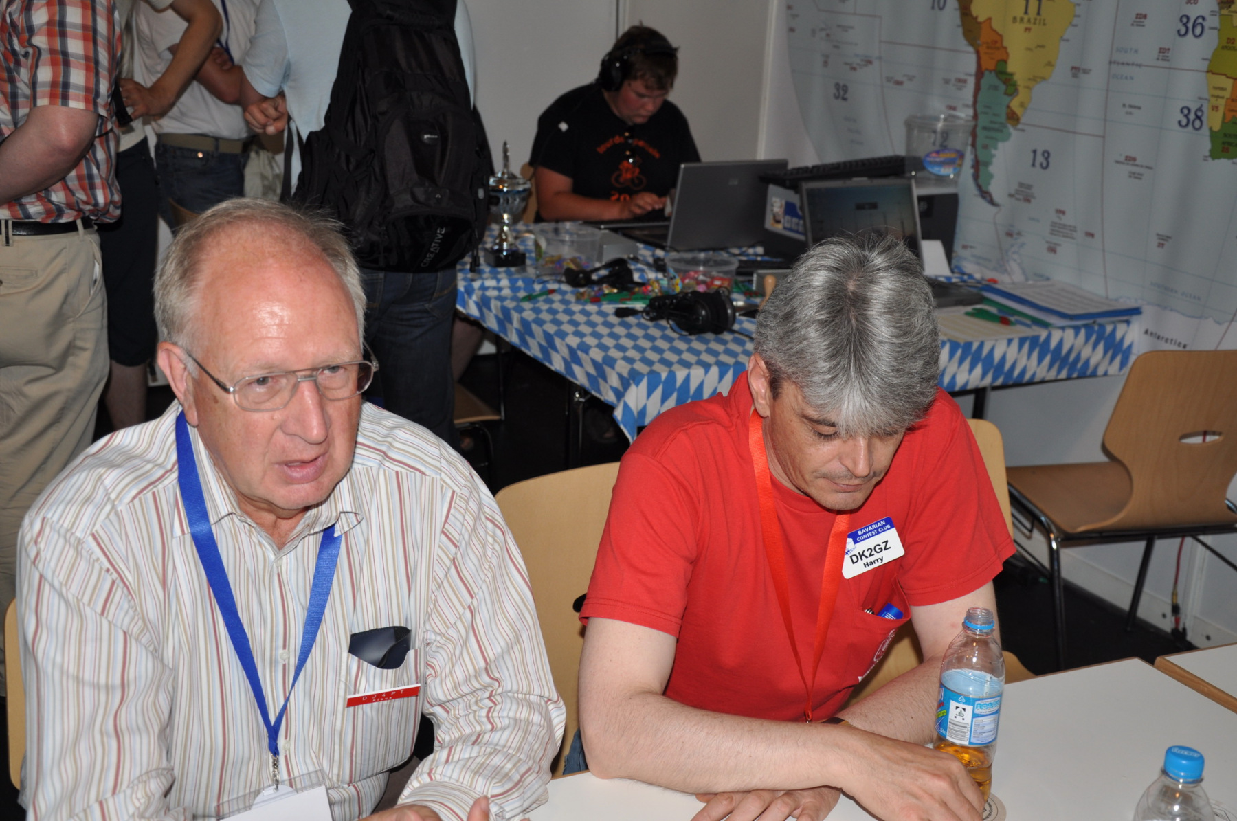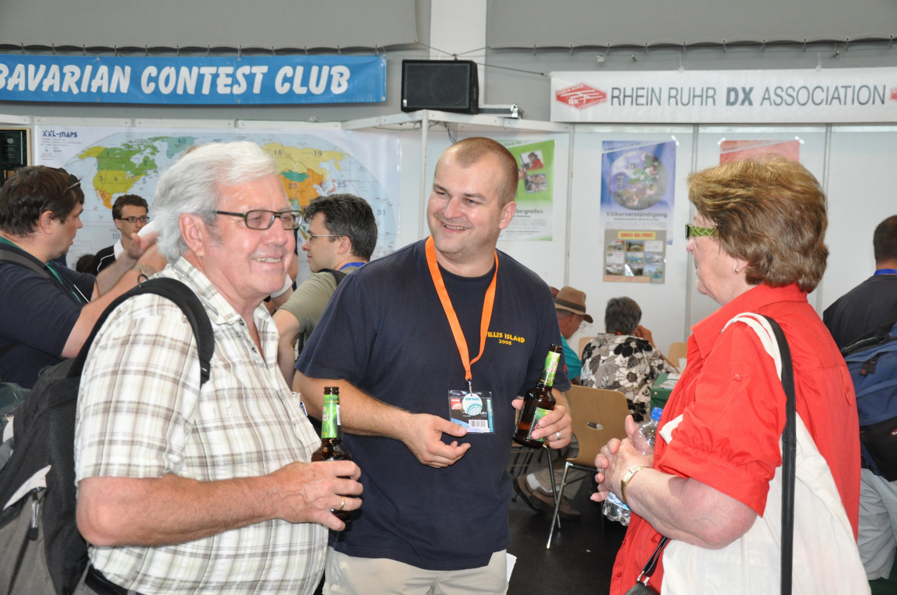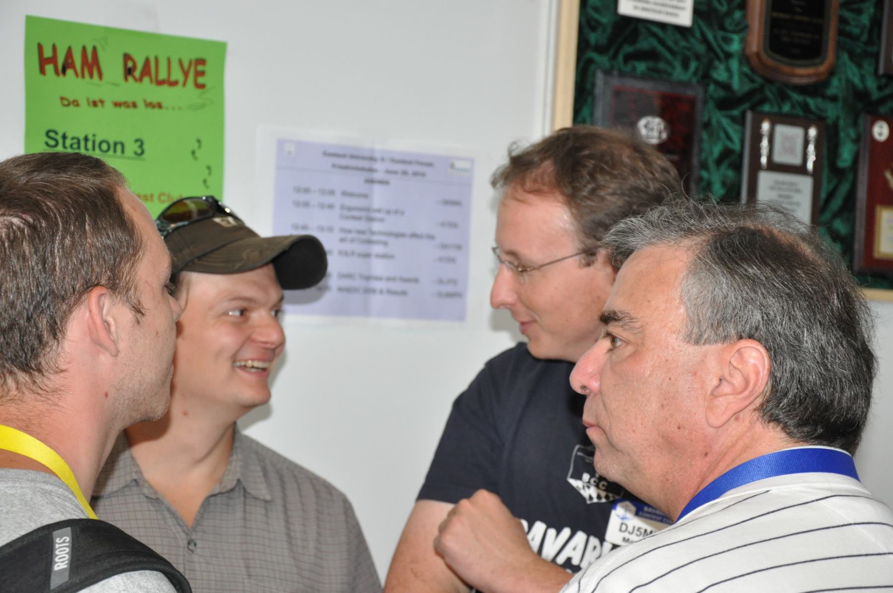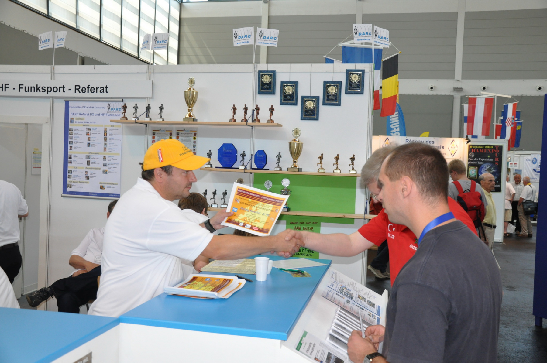 Der Freitag begann hektisch: Die Teilnehmer der ersten deutschen Contestuniversity sollten sich bei uns am Stand ihre Unterlagen abholen. Die Materialien waren inzwischen alle da, aber in vielen Kisten, Tüten und Schachteln. 10 Einzelteile mussten schnellstens in Beutel konfektioniert werden. Zum Glück standen genug Helfer parat, so dass die 150 Exemplare schnell fertig waren und ausgegeben werden konnten. Die ersten CTU-Teilnehmer tauchten auch schon auf und nahmen erfreut ihre Unterlagen samt Namensschild entgegen. Die gelben CTU-Basecaps waren fortan immer wieder auf der Messe zu sehen. Parallel dazu wurde unsere Anmeldeliste fürs BCC-Buffet auch schon deutlich länger, die BCC-Challenge für Erwachsene startete und auch die Kinder, die an der HAM Rallye teilnahmen, konnten das Namenspileup hören.