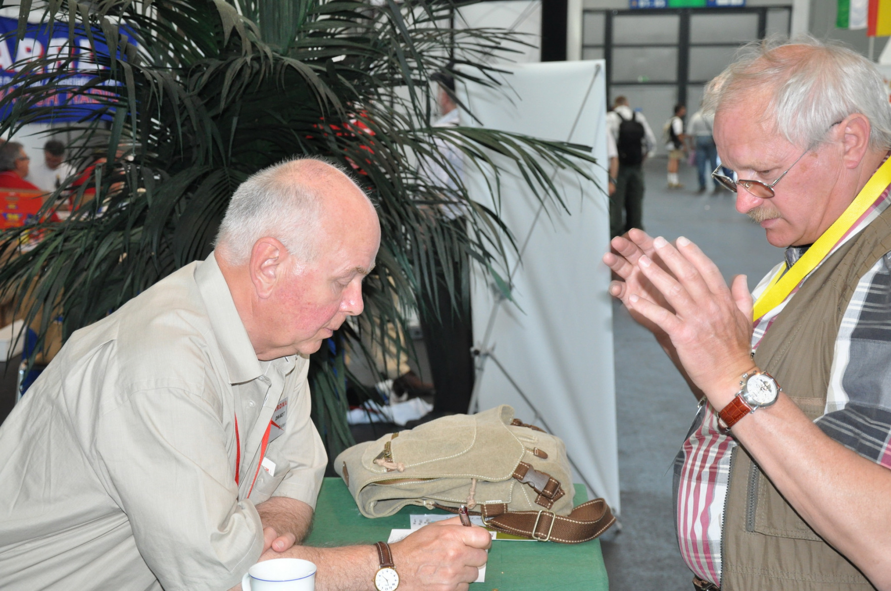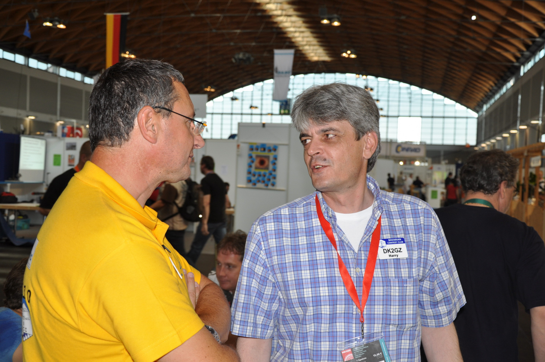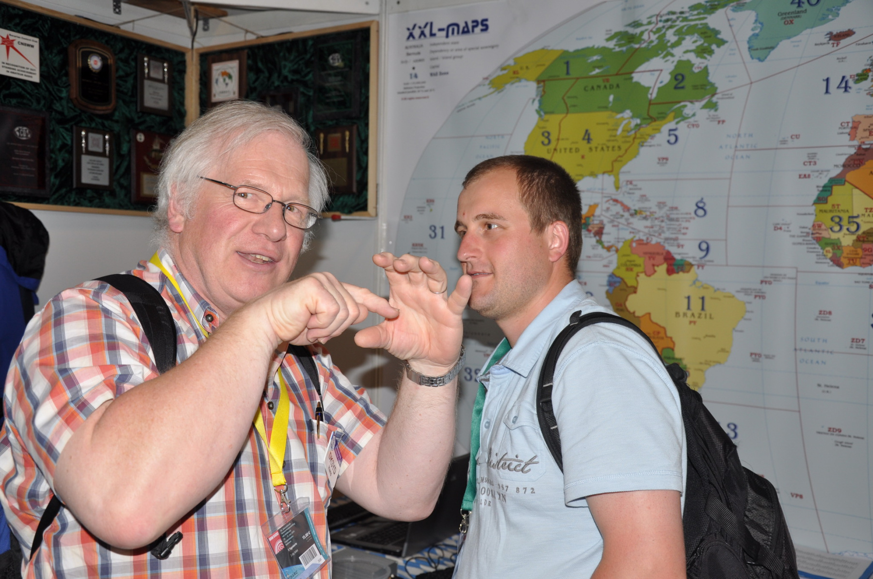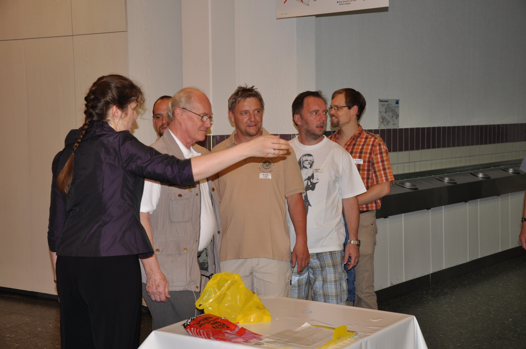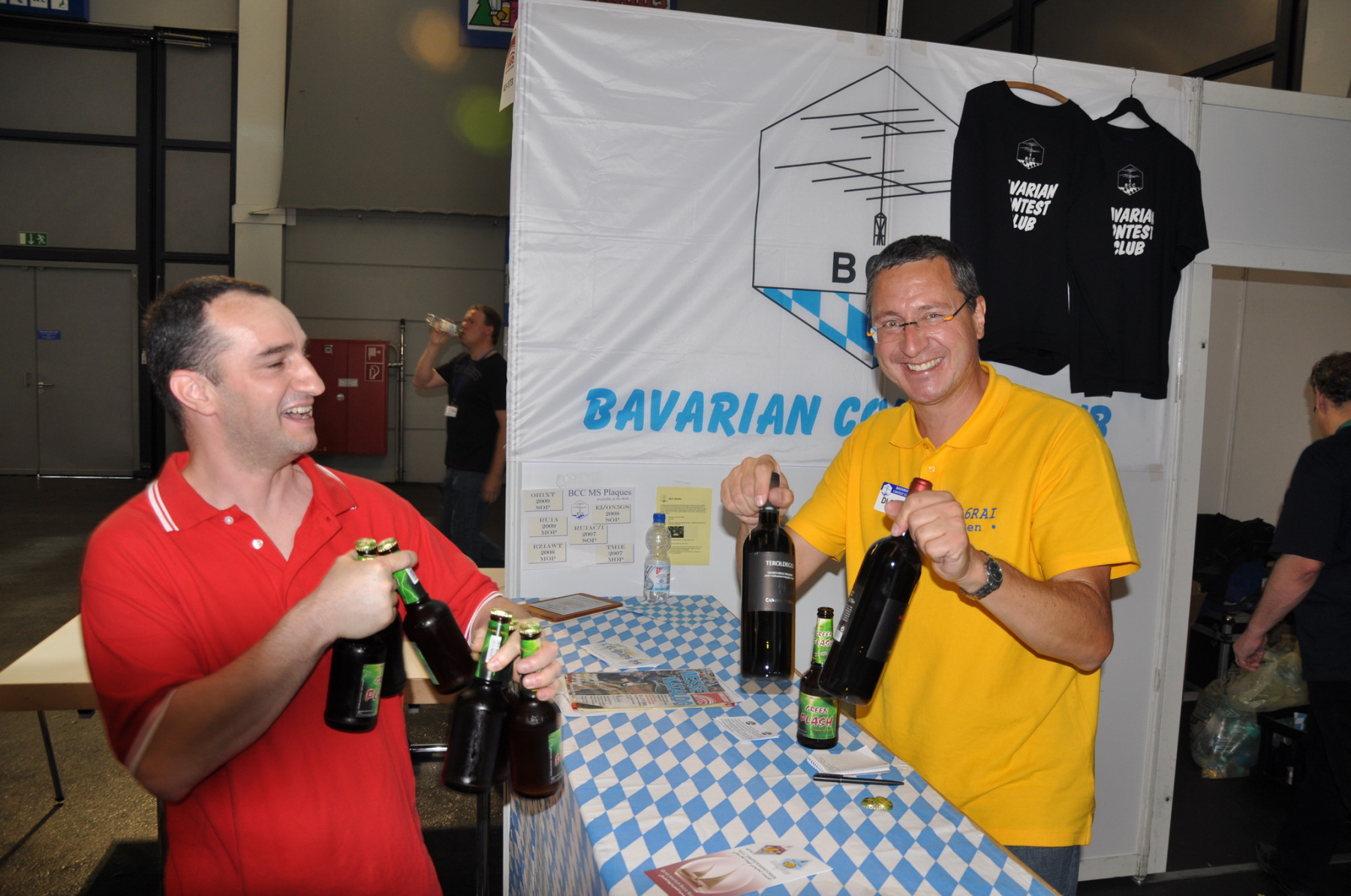 Der Freitag begann hektisch: Die Teilnehmer der ersten deutschen Contestuniversity sollten sich bei uns am Stand ihre Unterlagen abholen. Die Materialien waren inzwischen alle da, aber in vielen Kisten, Tüten und Schachteln. 10 Einzelteile mussten schnellstens in Beutel konfektioniert werden. Zum Glück standen genug Helfer parat, so dass die 150 Exemplare schnell fertig waren und ausgegeben werden konnten. Die ersten CTU-Teilnehmer tauchten auch schon auf und nahmen erfreut ihre Unterlagen samt Namensschild entgegen. Die gelben CTU-Basecaps waren fortan immer wieder auf der Messe zu sehen. Parallel dazu wurde unsere Anmeldeliste fürs BCC-Buffet auch schon deutlich länger, die BCC-Challenge für Erwachsene startete und auch die Kinder, die an der HAM Rallye teilnahmen, konnten das Namenspileup hören.