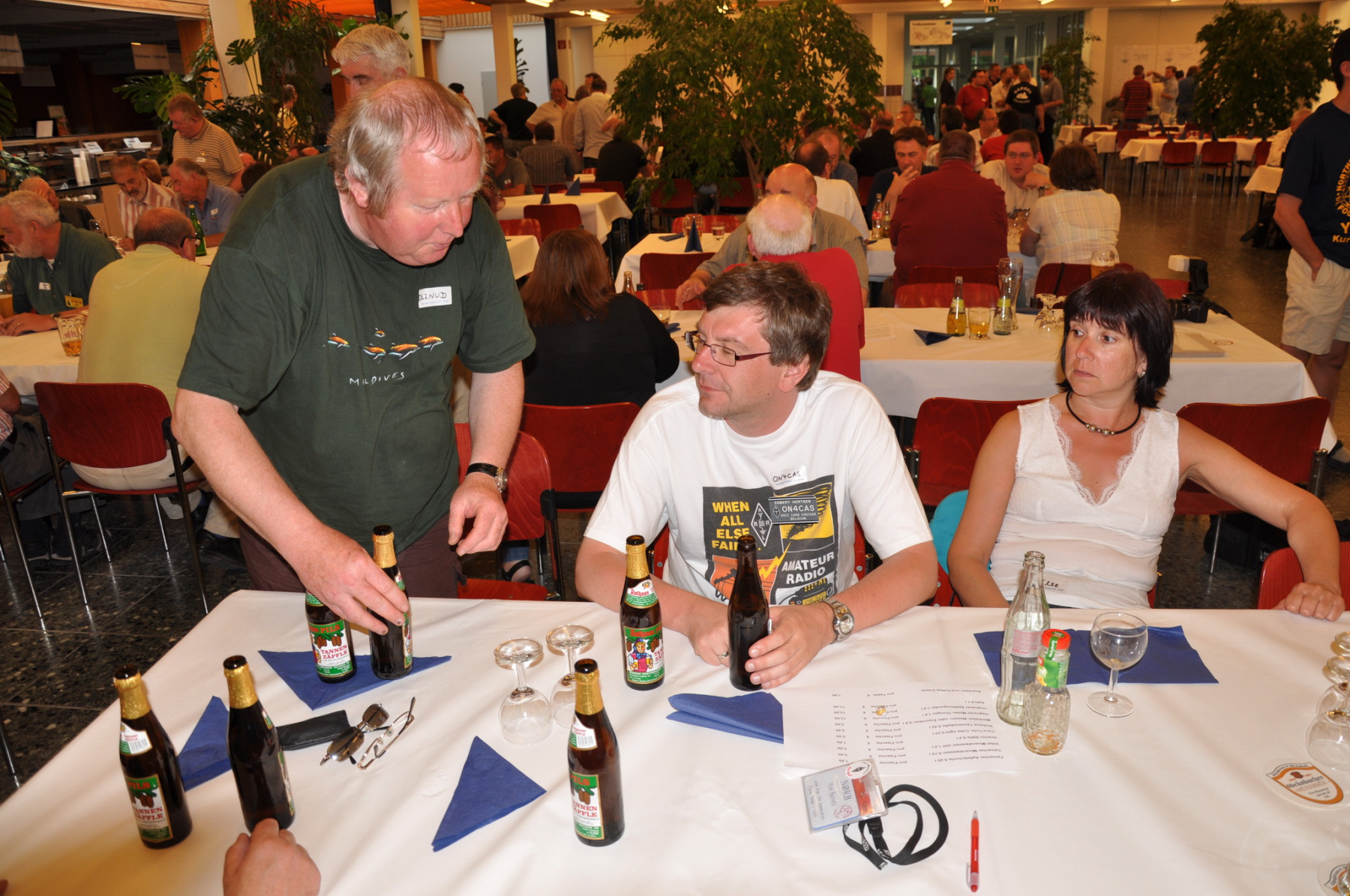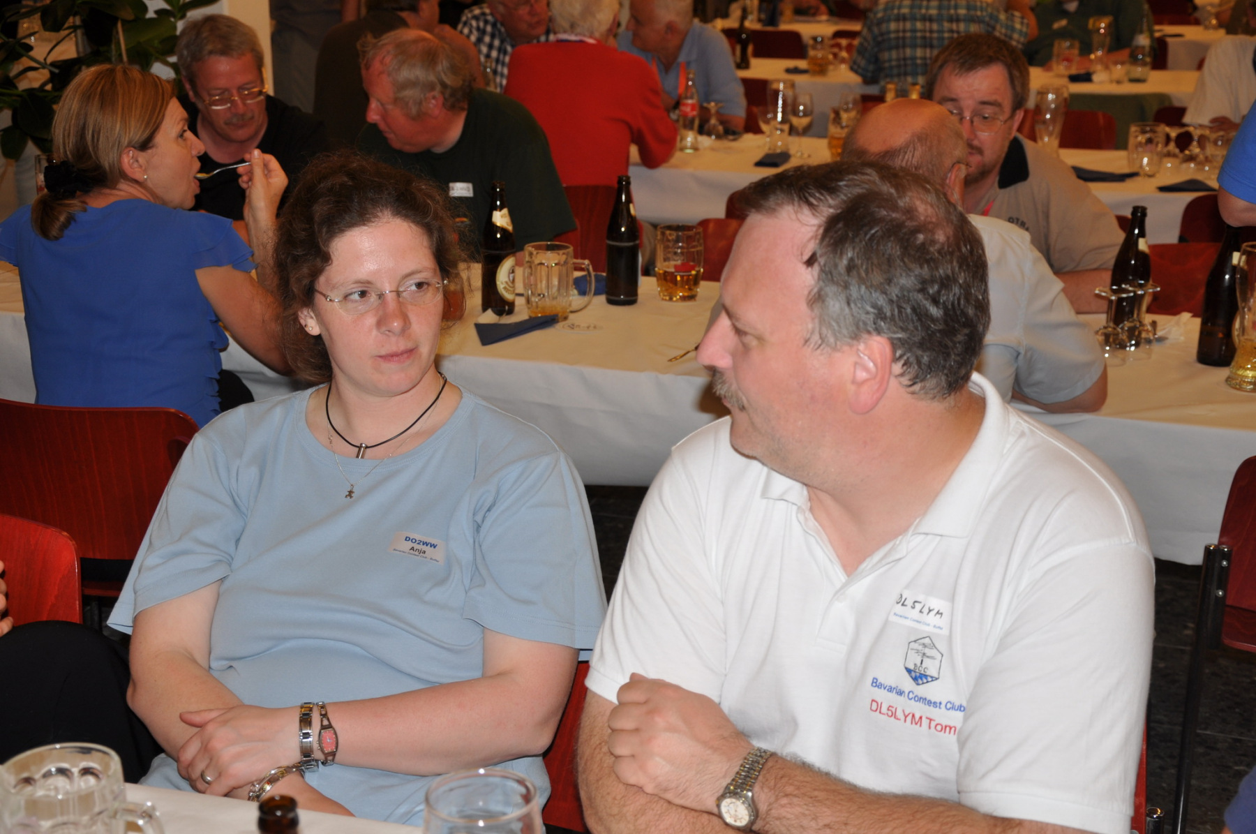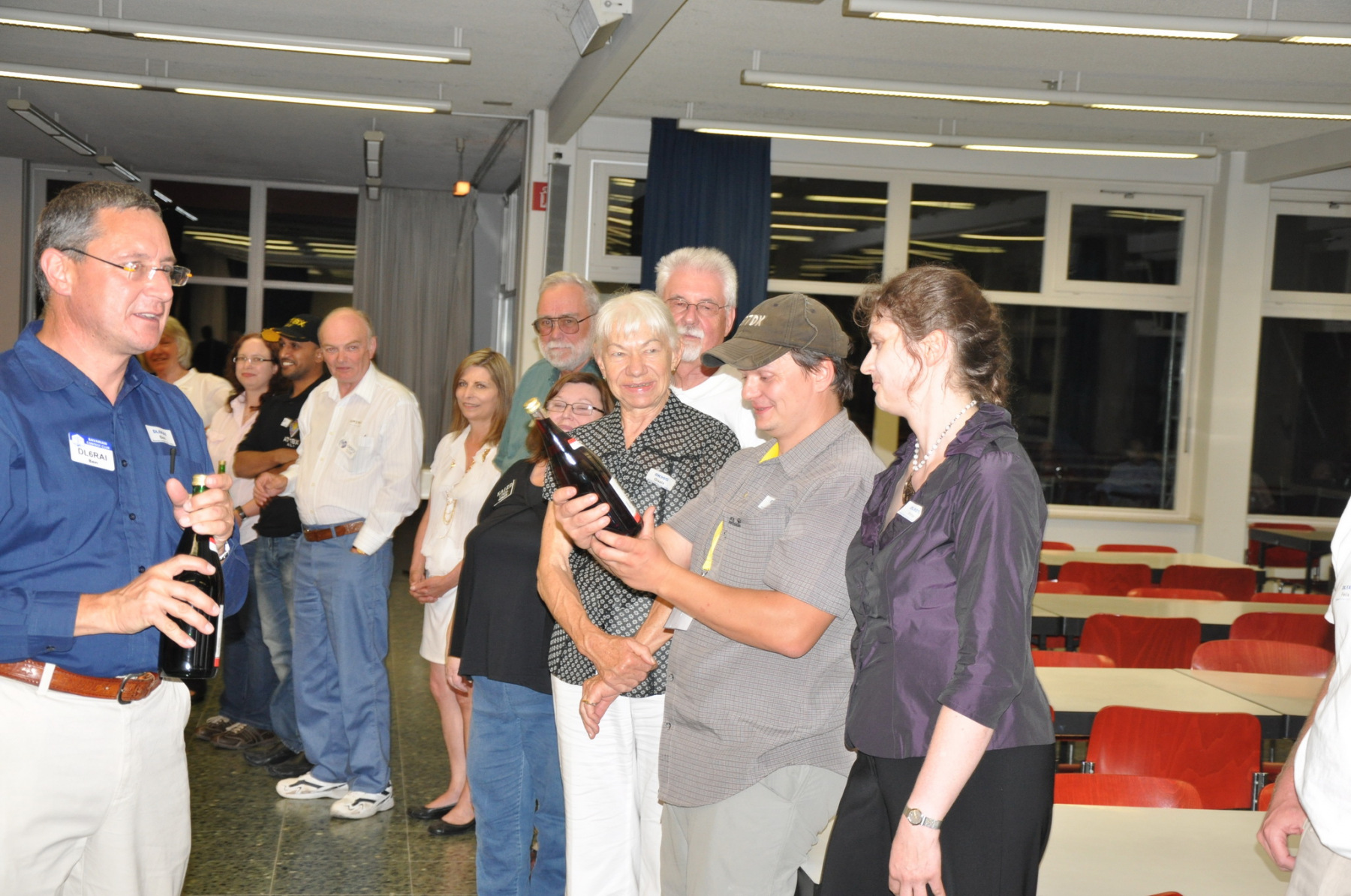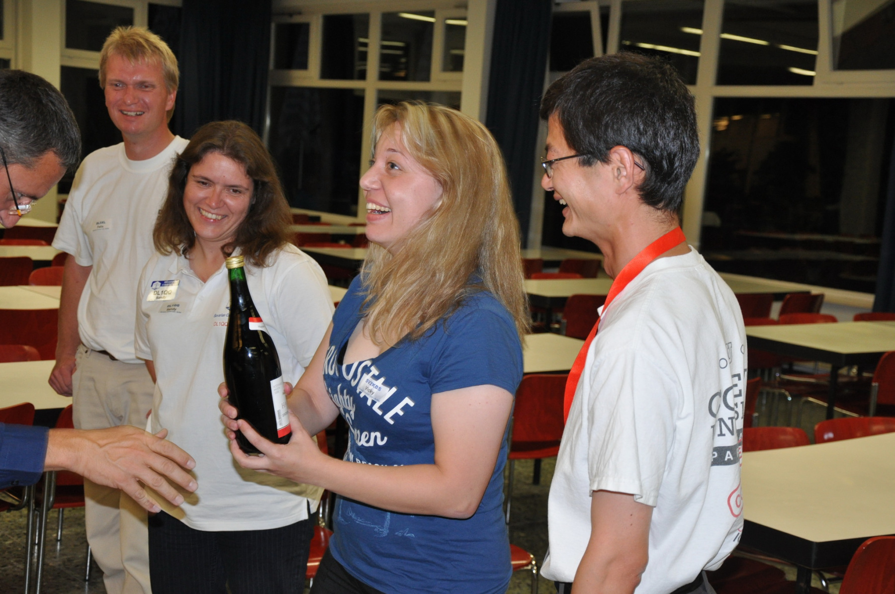 Später am Abend fand unter Leitung von PA1TT ein Team-Wettstreit statt. Die Teams wurden aus je einem OM und einer (X)YL gebildet. Unter dem wachsamen Auge des Contestkommittes, bestehend aus DL8WPX, K3EST und JH4RHF, mussten die Teams Fragen aus dem Funker- wie auch dem reellen Leben beantworten. Die Siegerteams konnten sich über eine Flasche Wein freuen, Spaß hatten alle.