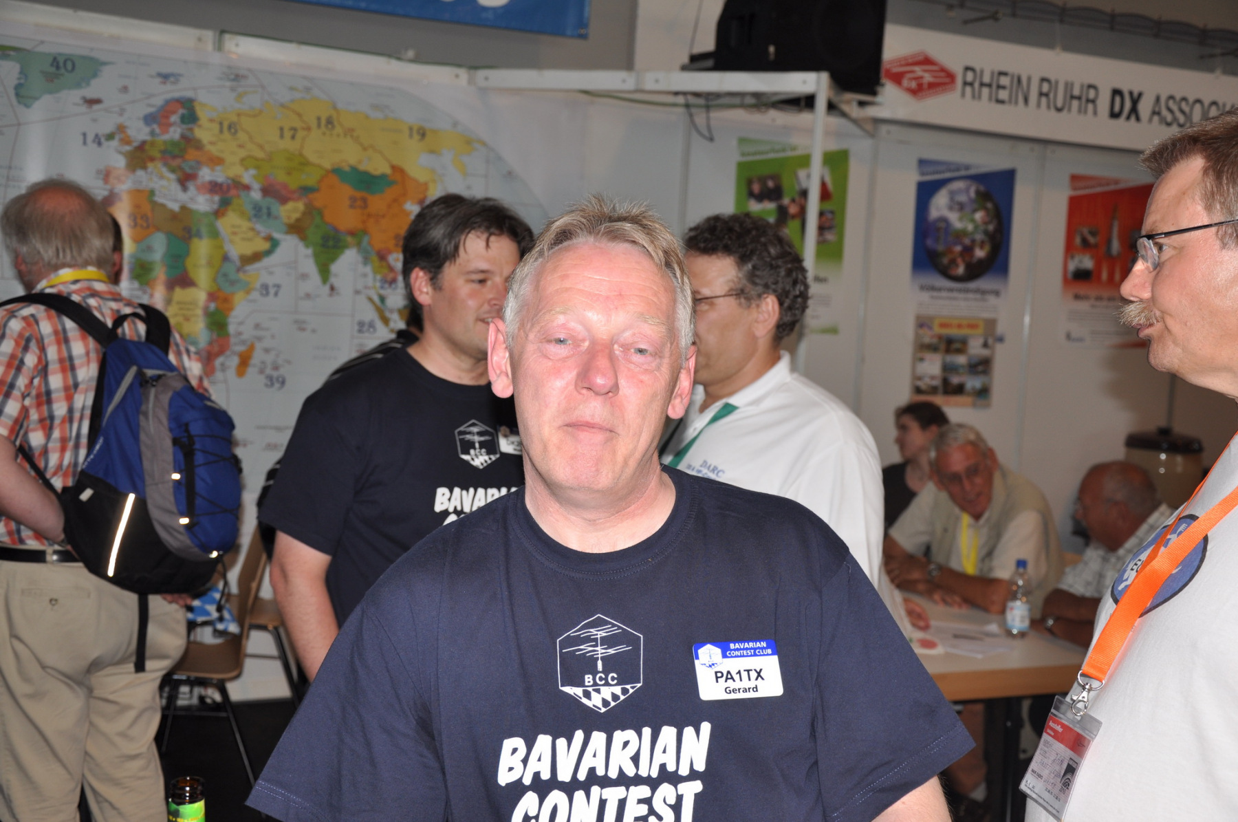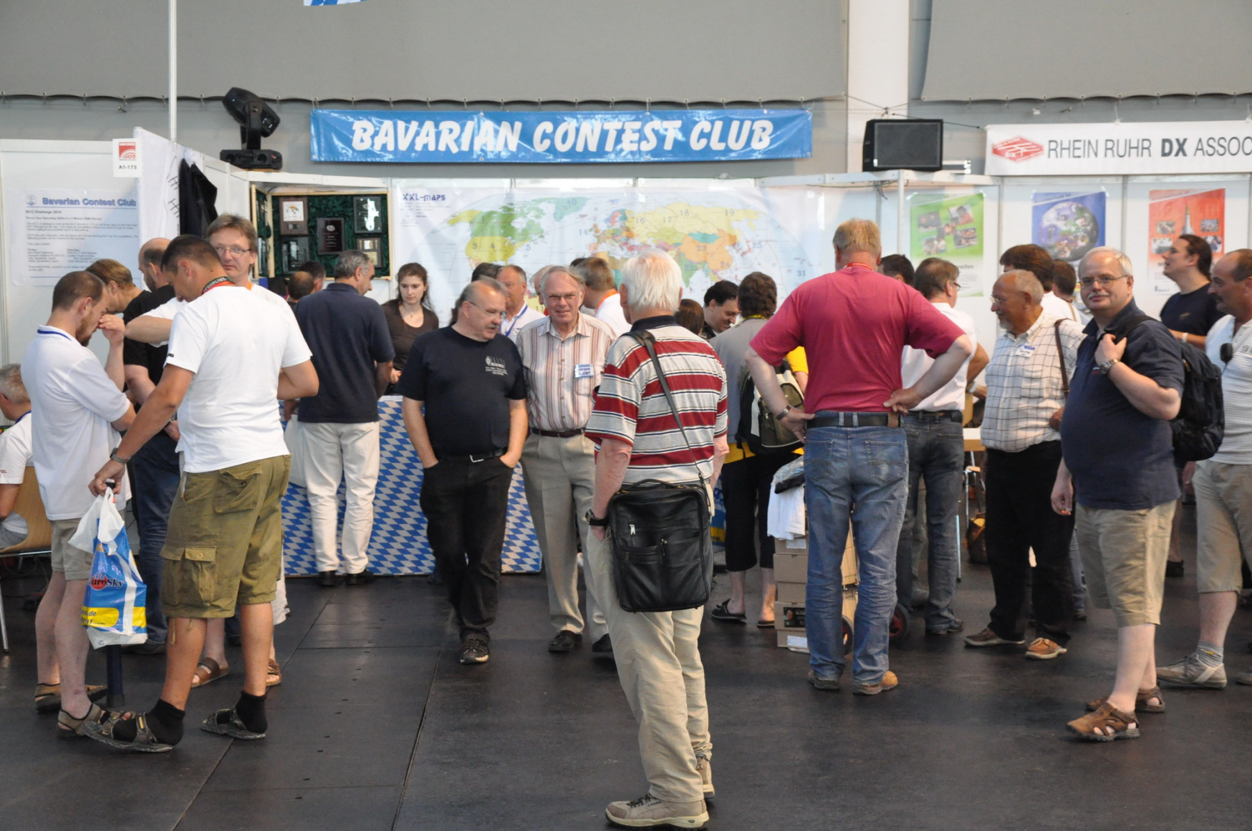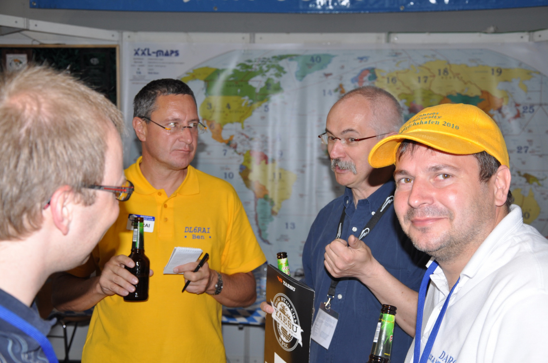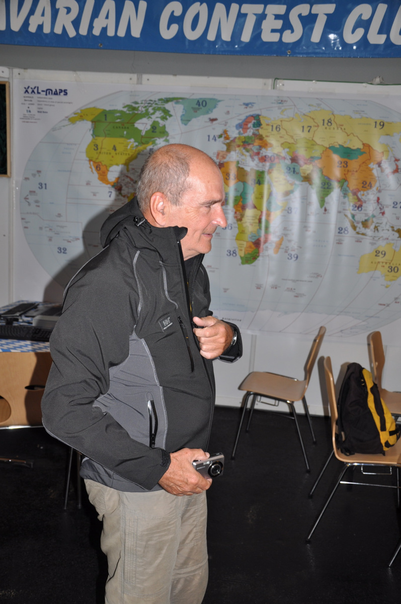 Unser Stand wurde wie immer Donnerstag nachmittag von vielen fleißigen Helfern (DB8NI, DK6WL, DJ1OJ, DK5OS, DL9YAJ, PA1TX, DL4MDO, DL5KUT, DL2MLU, DL6RAI, DL9DRA, DL8DYL) aufgebaut. Im Zentrum stand dieses Mal eine überdimensionale Weltkarte, die unsere Besucher immer wieder zum Diskutieren und Fachsimpeln anregte. Am Abend trafen sich die Aufbauhelfer mit weiteren Anreisenden traditionell in der Landvogtei in Dürnast. Ein lauer Sommerabend bei gutem Essen und Trinken ging hier zu Ende, Jan, PA1TT konnte sich sogar live über ein Tor der niederländischen Mannschaft zur WM freuen….