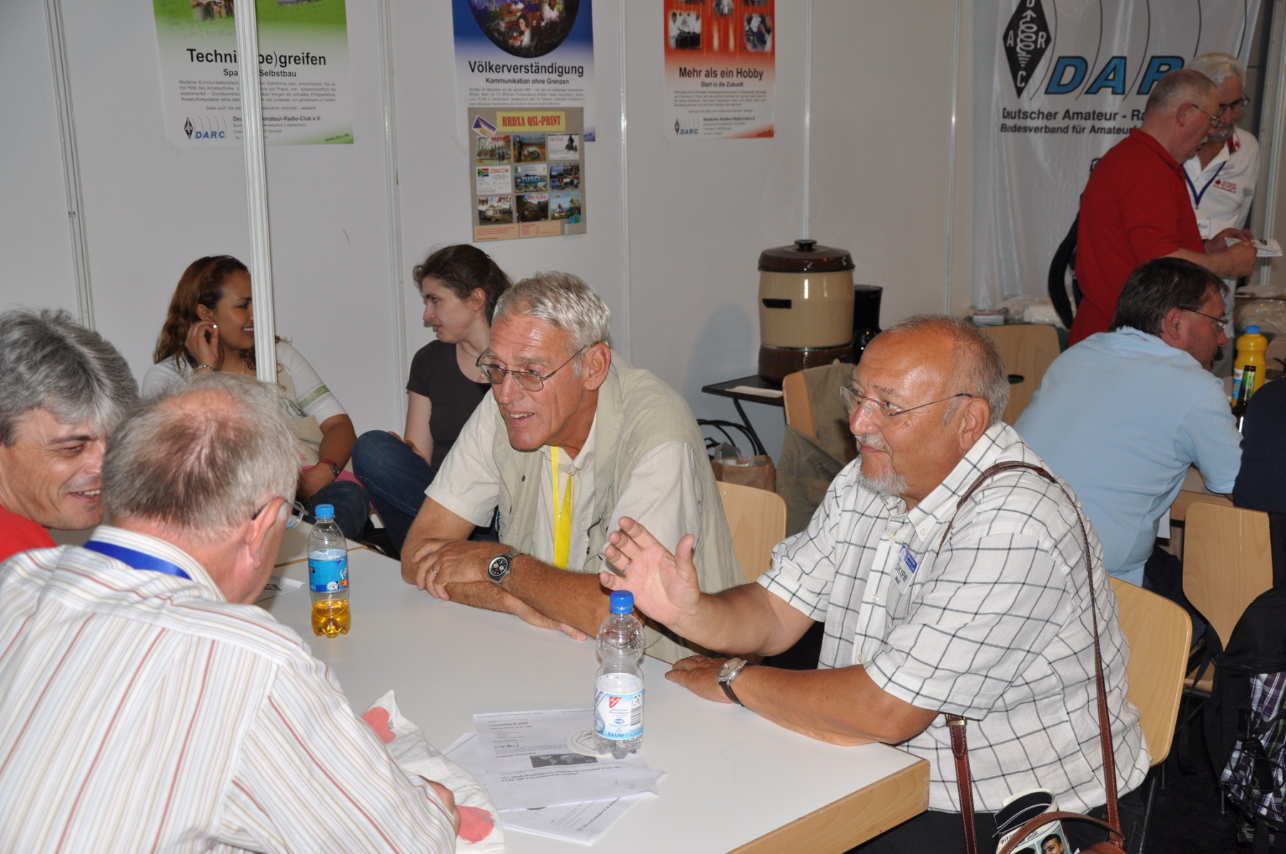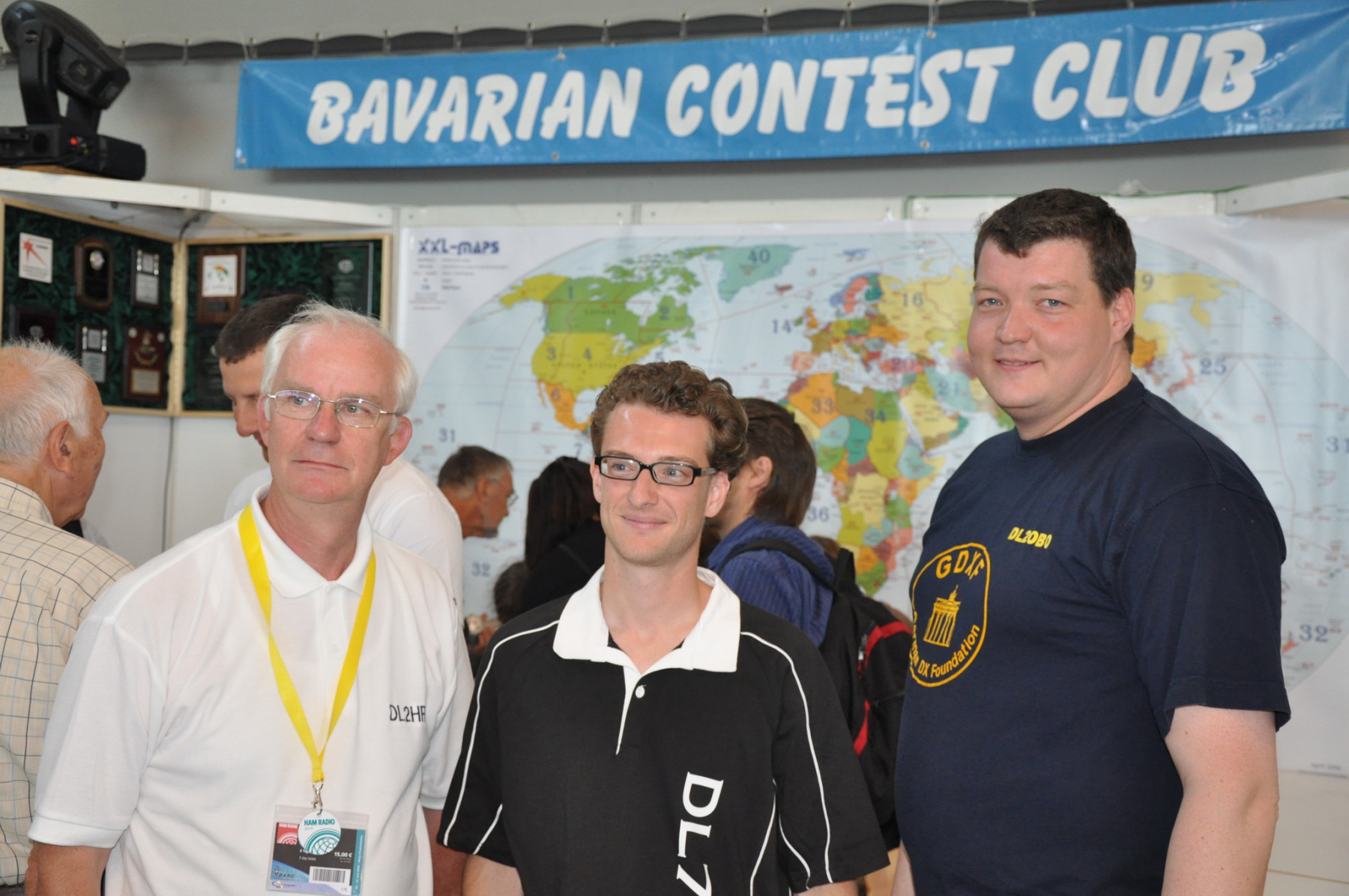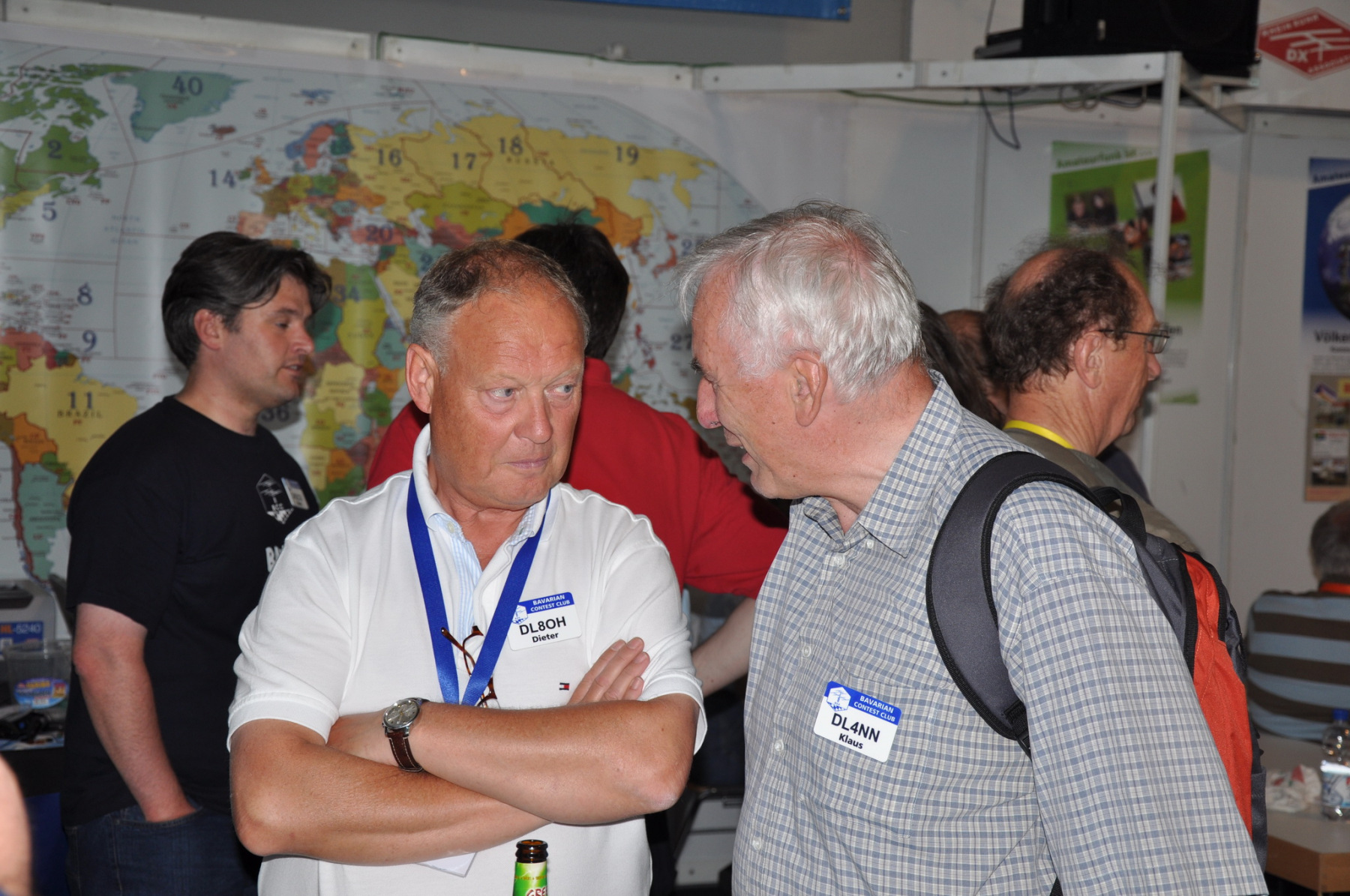 Unser Stand wurde wie immer Donnerstag nachmittag von vielen fleißigen Helfern (DB8NI, DK6WL, DJ1OJ, DK5OS, DL9YAJ, PA1TX, DL4MDO, DL5KUT, DL2MLU, DL6RAI, DL9DRA, DL8DYL) aufgebaut. Im Zentrum stand dieses Mal eine überdimensionale Weltkarte, die unsere Besucher immer wieder zum Diskutieren und Fachsimpeln anregte. Am Abend trafen sich die Aufbauhelfer mit weiteren Anreisenden traditionell in der Landvogtei in Dürnast. Ein lauer Sommerabend bei gutem Essen und Trinken ging hier zu Ende, Jan, PA1TT konnte sich sogar live über ein Tor der niederländischen Mannschaft zur WM freuen….