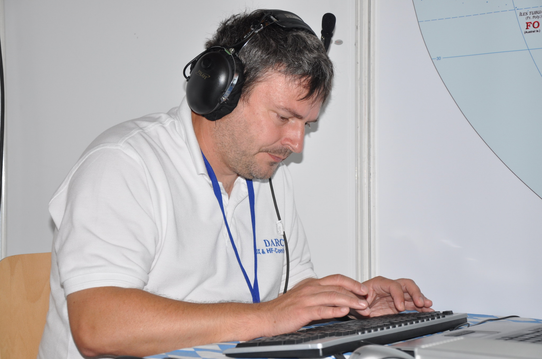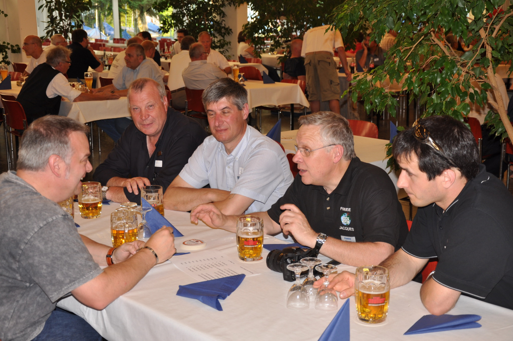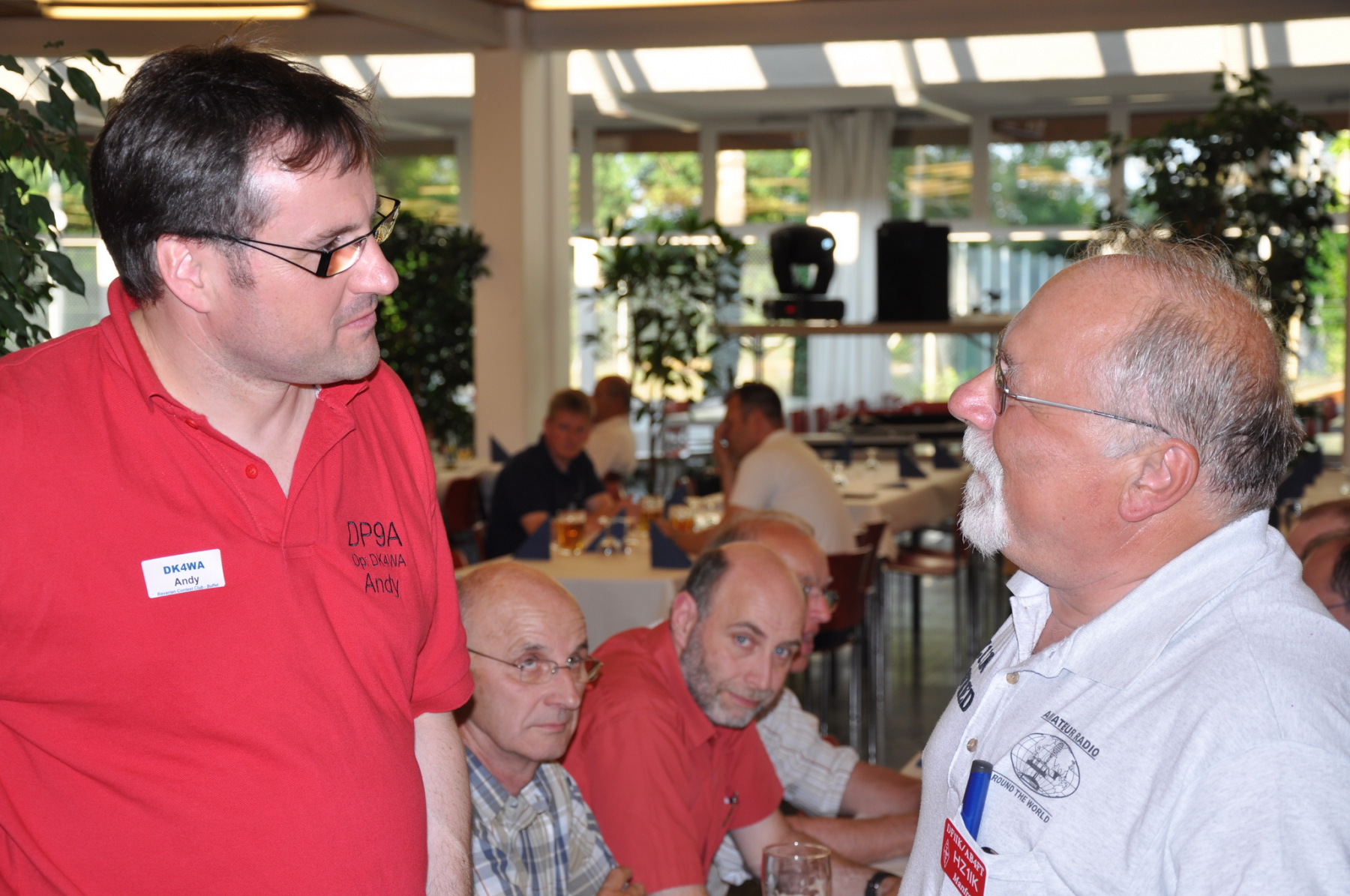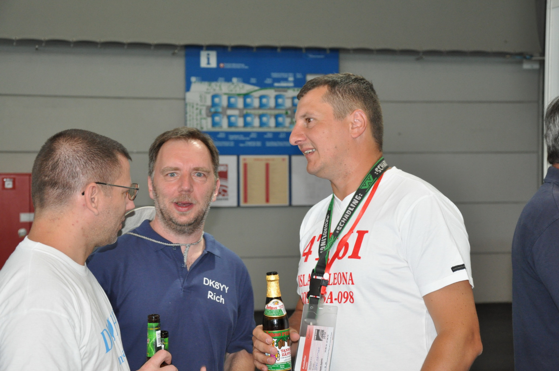 Unser Stand wurde wie immer Donnerstag nachmittag von vielen fleißigen Helfern (DB8NI, DK6WL, DJ1OJ, DK5OS, DL9YAJ, PA1TX, DL4MDO, DL5KUT, DL2MLU, DL6RAI, DL9DRA, DL8DYL) aufgebaut. Im Zentrum stand dieses Mal eine überdimensionale Weltkarte, die unsere Besucher immer wieder zum Diskutieren und Fachsimpeln anregte. Am Abend trafen sich die Aufbauhelfer mit weiteren Anreisenden traditionell in der Landvogtei in Dürnast. Ein lauer Sommerabend bei gutem Essen und Trinken ging hier zu Ende, Jan, PA1TT konnte sich sogar live über ein Tor der niederländischen Mannschaft zur WM freuen….
