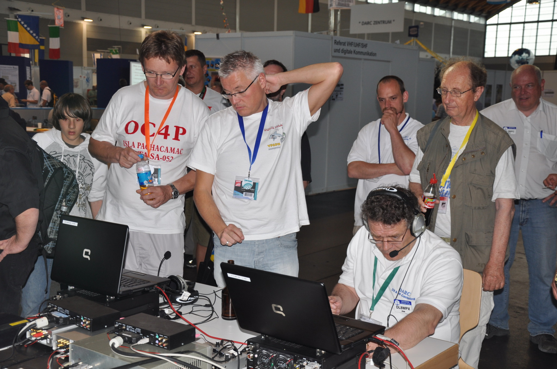 In der Zwischenzeit startete am BCC-Stand eine andere Vorführung: Unser WRTC-Team DL6FBL und DL3DXX baute seine Technik für einen letzten Test auf. Das Interesse der Besucher war riesig und viele Fragen mussten beantwortet werden. An dieser Stelle schon mal viel Glück und Erfolg in Moskau.