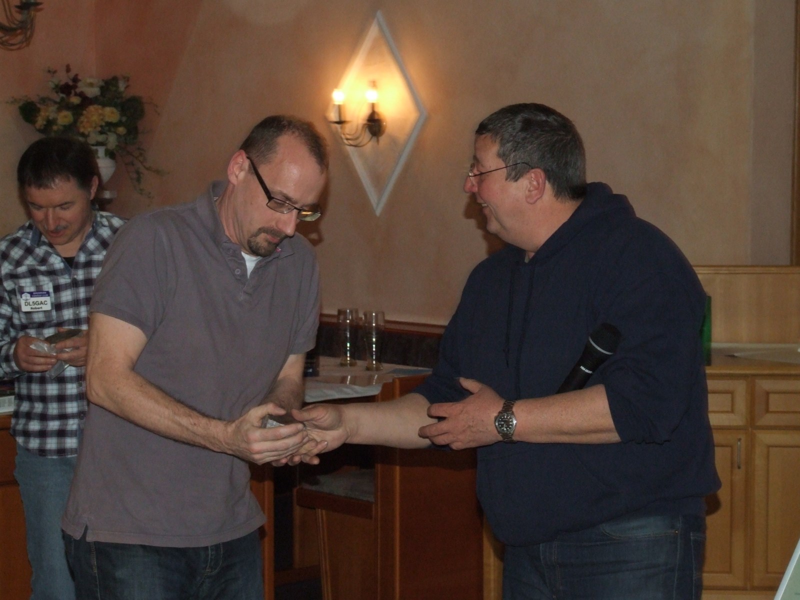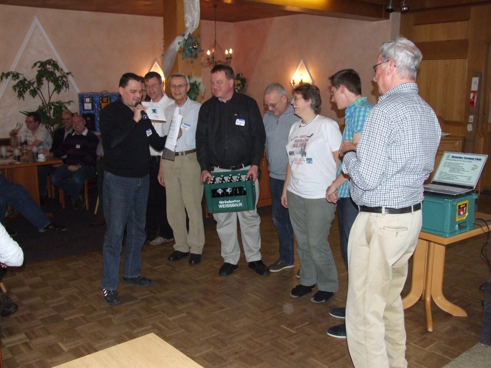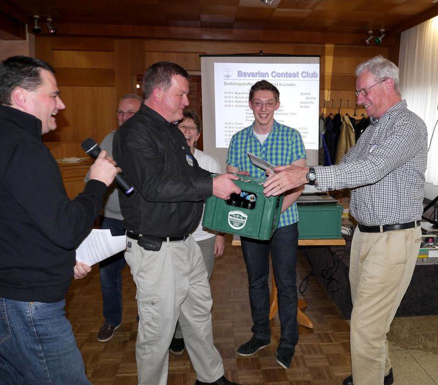 Bevor es mit dem Programm losging, bat Tom, DK5MB um das Mikro. Er ist Mitglied im OV C25. Der ein oder andere kannte vermutlich den Bericht von Rudi, DJ3WE zum 10m-Contest. Rudi hatte in diesem Contest den Eindruck, immer oder überall C25er zu treffen. Der Eindruck war richtig! Schon allein die Zahl der in Linden anwesenden Mitglieder von C25 war enorm. Und im Contest waren noch mehr aktiv. Auch im März-Contest will der OV wieder ganz viele Mitglieder mobilisieren. Damit Rudi mit den vielen C25ern klar kommt, übergab ihm der OV hier etwas Nervennahrung von der Grünbacher Brauerei. Der Saal freute sich mit ihm….