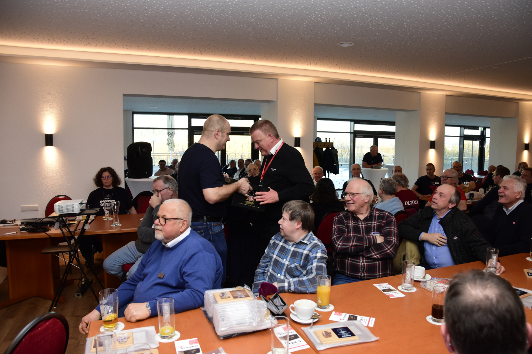 Die Logbücher von DA0BCC füllen sich mehr und mehr: 28.686 QSOs stehen zu Buche. René, DL2JRM gab eine Übersicht zu den Aktivierungen im abgelaufenen Jahr. Dass die Betriebsart CW lebt, wird einmal mehr nur allzu deutlich: 17.838 CW-QSO stehen 6.098 SSB- und 4.694 RTTY-Verbindungen gegenüber. FT8-QSOs sind mit 56 QSOs festgehalten. Dass das Funken mit dem Call DA0BCC belohnt wird, zauberte Michael, DC8YZ ein Lächeln ins Gesicht, denn er konnte mit 6.205 QSOs die BCC-Tasse mit goldenem Schriftzug entgegennehmen. Die Silbertassen gingen an Klaus, DF1DT, Robby, DM6DX und René, DL2JRM. Die Tassenauszeichnung in Blau erhielten Jelmer, DJ5MO, Bernd, DL8MAS, Fritz, DL7ON und Lutz, DM6EE. Klaus, DF1DT, Hajo, DJ9MH, Bernd, DL8MAS und Lutz, DM6EE aktivierten 2024 jeden Montag DA0BCC zum MWC-Contest. Dafür gab es jeweils eine Sondertasse mit den entsprechenden Bezeichnungen. Weitere Aktivatoren von unserem Clubcall waren DM5JBN, DA6NEN, DK7AM, DL5NEN, DJ9MH, DL1MGB, DJ5AN, DM7XX, DL9DRA, DL3DXX, DL8DYL, DM4KA und DL8DXL. René warb für weitere DA0BCC-Aktivitäten in diesem Jahr.