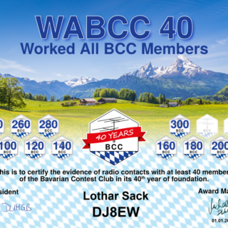 Anlässlich seines 40-jährigen Bestehens gibt der Bavarian Contest Club (BCC) im Zeitraum 1. Januar 2023 bis 31. Dezember 2023 das Diplom WABCC40 (Worked All BCC Members) heraus. Es kann weltweit von Funkamateuren bzw. Kurzwellenhörern...