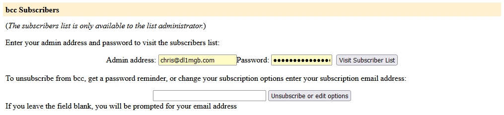 You can get your password at any time. Please visit https://lists.bavarian-contest-club.de/mailman/listinfo/bcc. If needed you can switch language from German to English in the upper right corner of the site.
