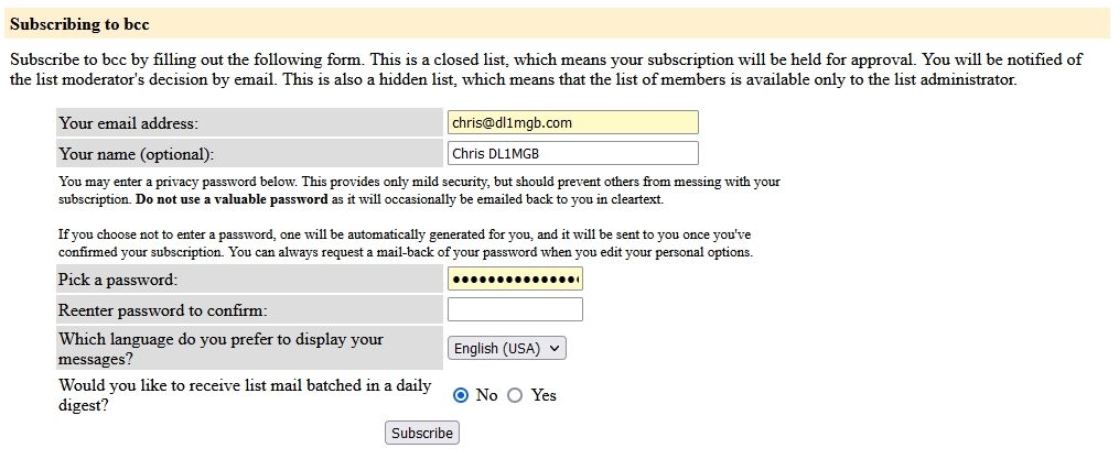 Go to the section “Subscribing to bcc” and enter your email address, your name/callsign (optional), the desired password and click on “Subscribe”. Our administrators will then release the registration directly (if the e-mail address is known) or they will request proof of identification before release. This is to protect the mailing list from abuse.
